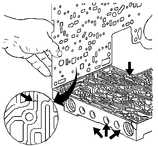 1. Inspect the valve body to spacer plate gasket for valve body channel witness marks. The witness marks should be complete. Incomplete witness marks may be caused by an uneven case surface. Incomplete witness marks may also be caused by cross-channel leaks.