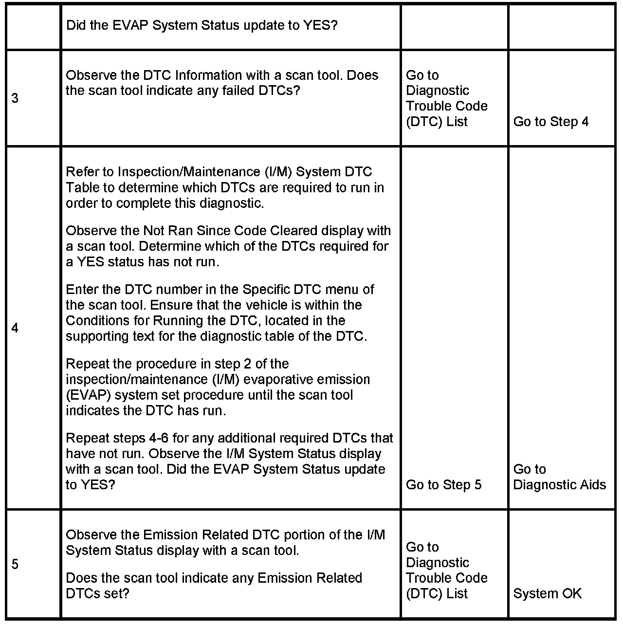 The procedure may be used to set the EVAP I/M System Status display on the scan tool to YES. The EVAP I/M System Status display indicates whether or not the control module has completed the readiness diagnostics. The readiness diagnostics complete when all DTCs comprising the diagnostics run and pass, or any DTC comprising the diagnostics illuminates the malfunction indicator lamp (MIL). If the diagnostics pass during one drive cycle, seventeen hours must elapse, regardless of whether the vehicle is driven or not. Then, the diagnostics will run again during the next drive cycle in which the conditions for running are met. Once the diagnostics have passed during the third drive cycle, the EVAP I/M System Status display will be updated to YES. A failed or aborted diagnostic will require vehicle to cool down in order to meet the enable criteria for another drive cycle. Therefore, performing a visual inspection prior to running the EVAP test may prevent having to repeat the drive cycle.