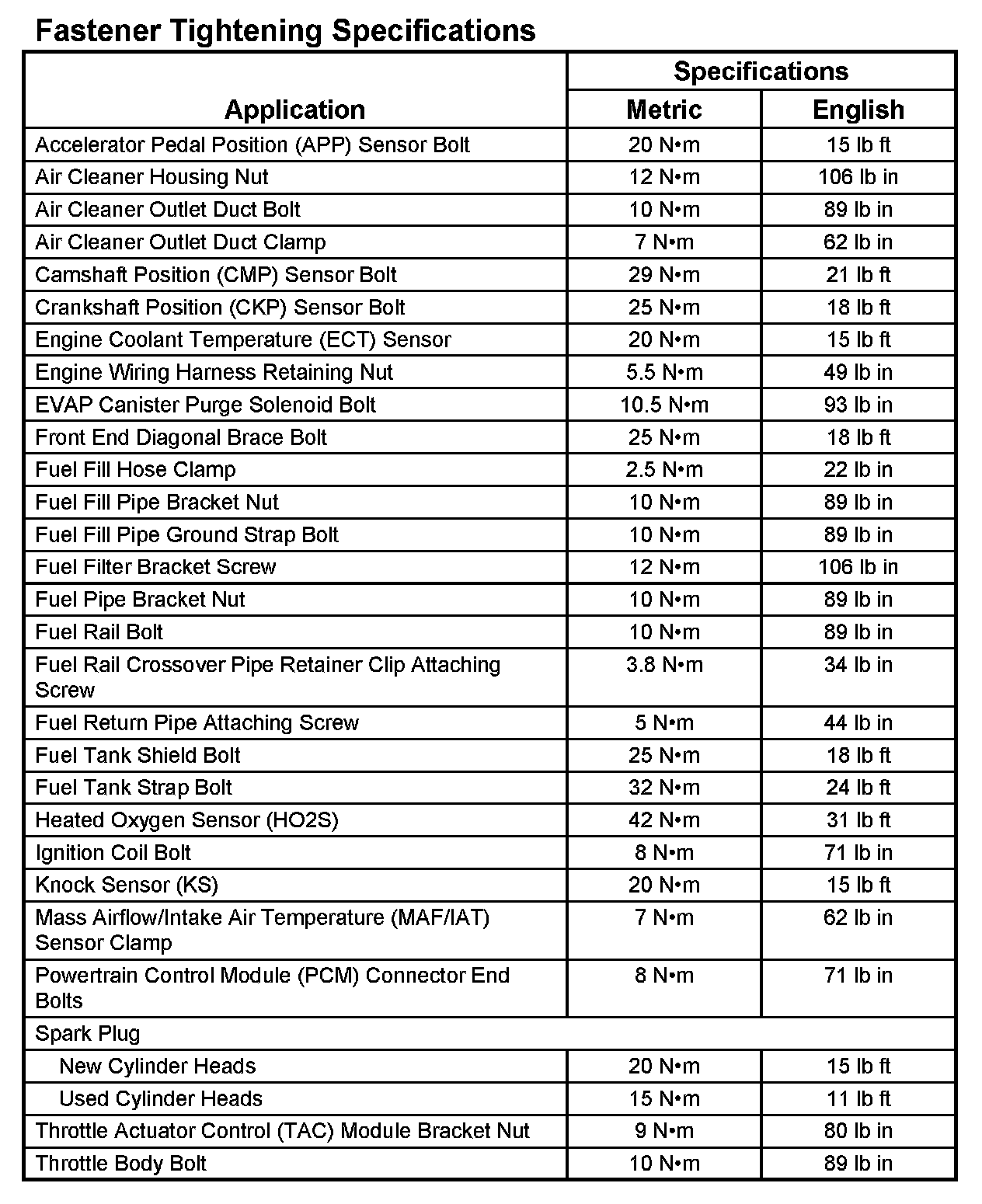Fastner Tightening Specifications: