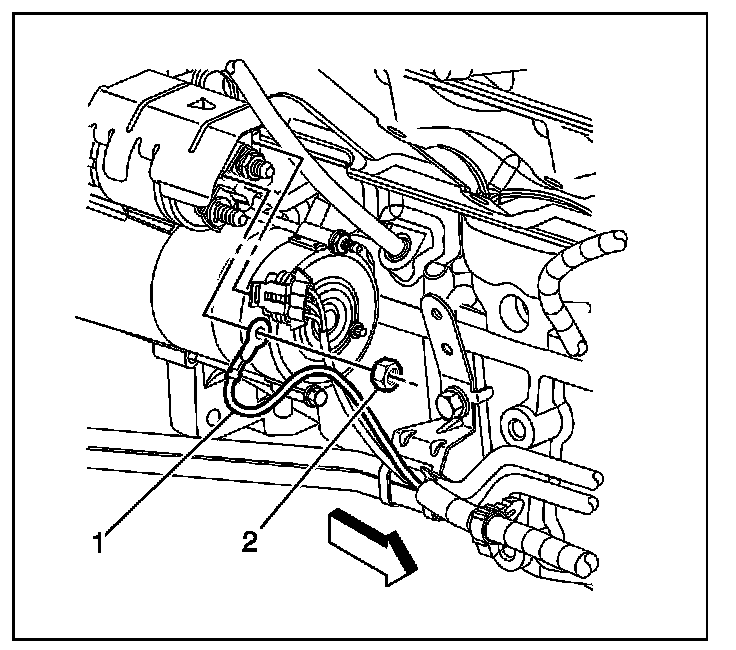 11. Remove the positive cable lead nut (2) from the starter.