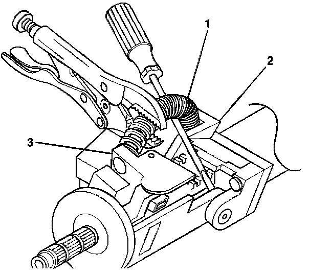 4. Remove one end of the tilt spring (1) from the steering column support assembly (2) and the other end from the steering column tilt head assembly (3) by using the following procedure: