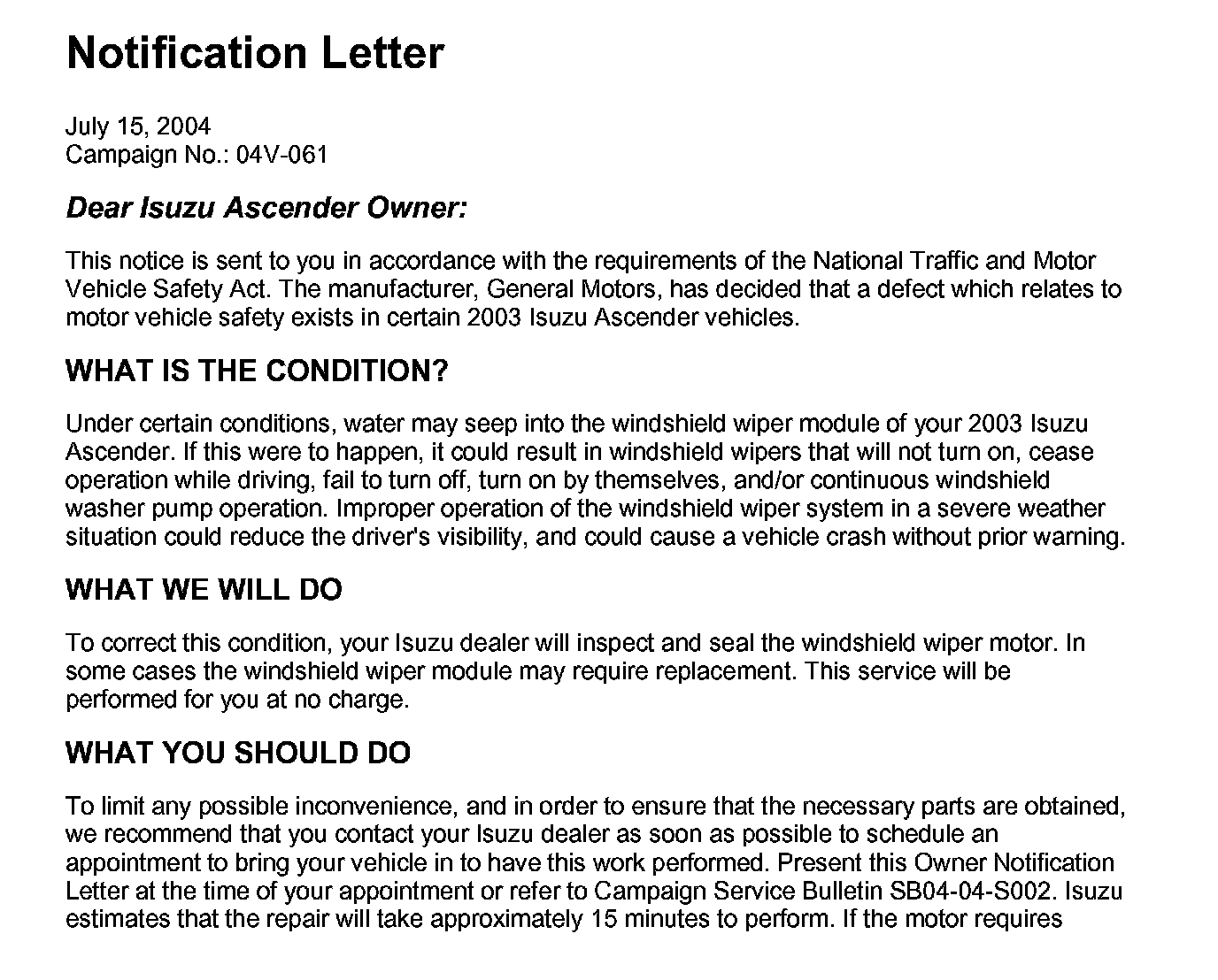 Recall - Wiper Motor/Module Defect