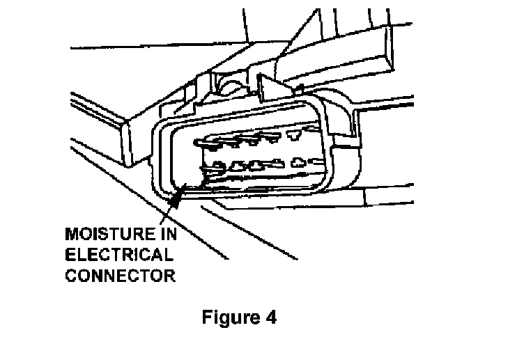 16. Inspect the inside of the electrical connector on the wiper motor for moisture or water. If no moisture or water is found, continue inspecting for evidence or signs that moisture or water was present at some earlier time. Indicators include water stains, dried dirt, etc (see figure 4).