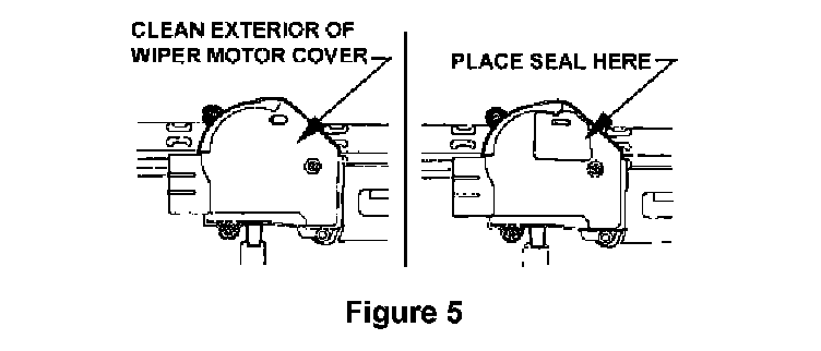 20. Remove the backing material from the seal, align it over the wiper motor cover so that it completely covers the vent and press it firmly into place as shown in the above illustration. Apply firm pressure across the entire surface of the seal and around all outside edges. Continue applying pressure a second time to the edges to assure full adhesion (refer to figure 5).