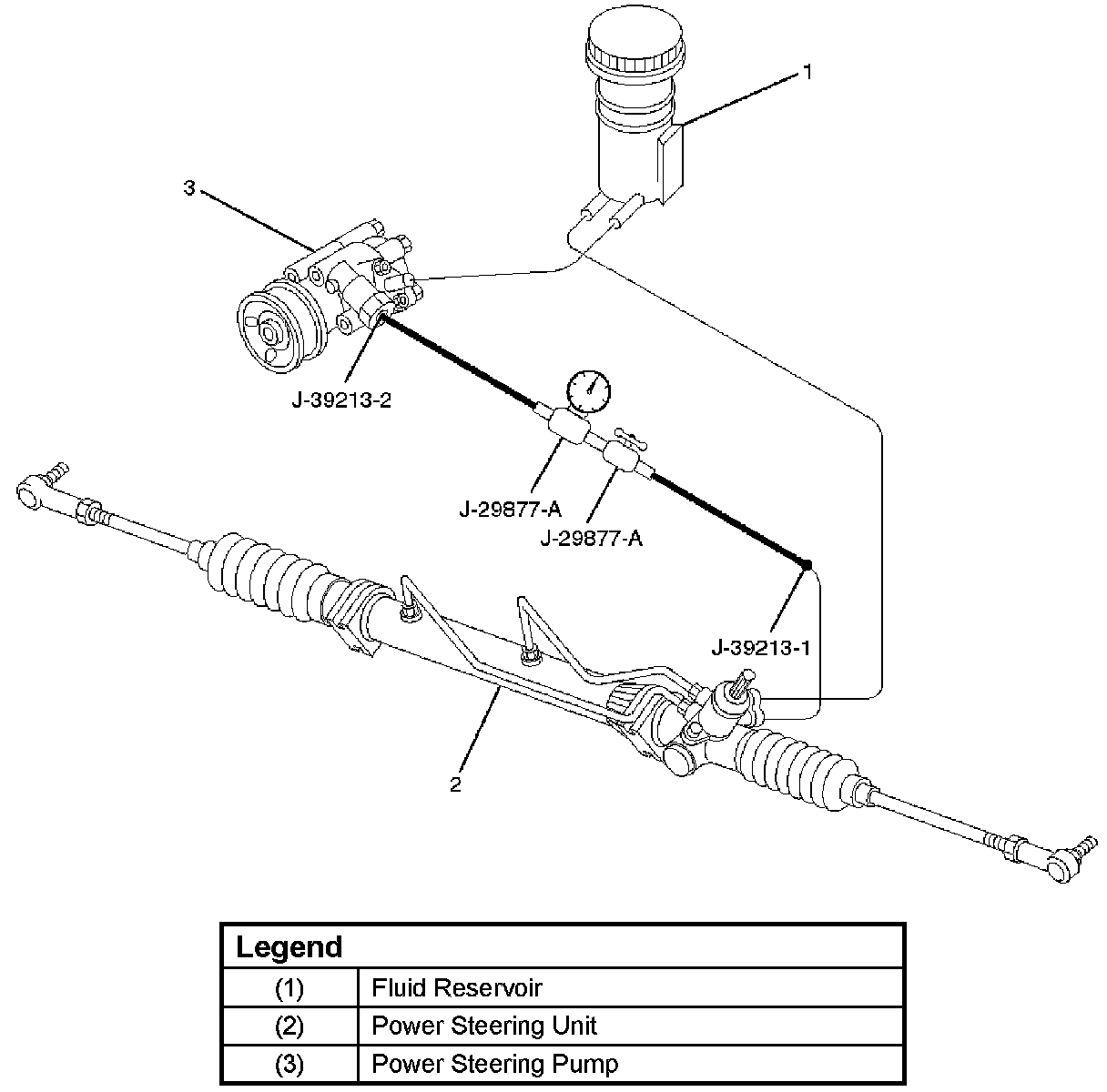 2. With the engine NOT running, disconnect the pressure hose at the power steering pump and install power steering tester J-29877-A. The gage must be between the shutoff valve and pump. Open the shut off valve.