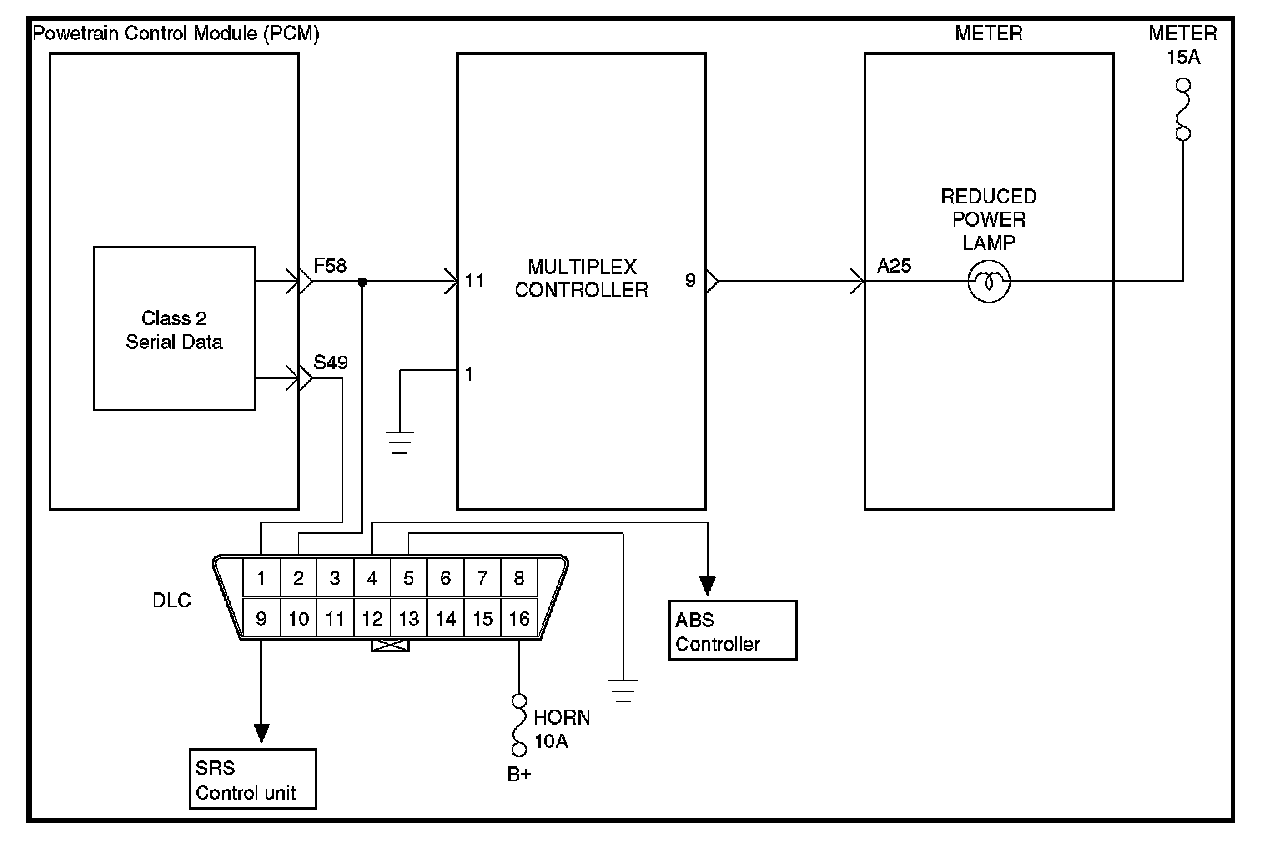 The Reduced Power lamp (RPL) should always be illuminated and steady with the ignition "ON" and the engine stopped. Ignition feed voltage is supplied to the RPL bulb through the meter fuse. The powertrain control module (PCM) orders the RPL "ON" signal for Multiplex Control Unit. When Multiplex Control Unit is received RPL "ON" signal that turn RPL "ON" by grounding the RPL driver circuit.