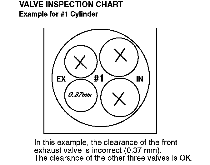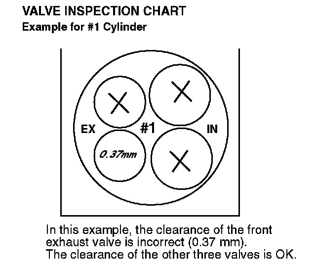 4. For valves with the correct clearance, draw an "X" in the appropriate circle on the Valve Inspection Chart. For valves with incorrect clearances, write down the clearance you measured in the circle.