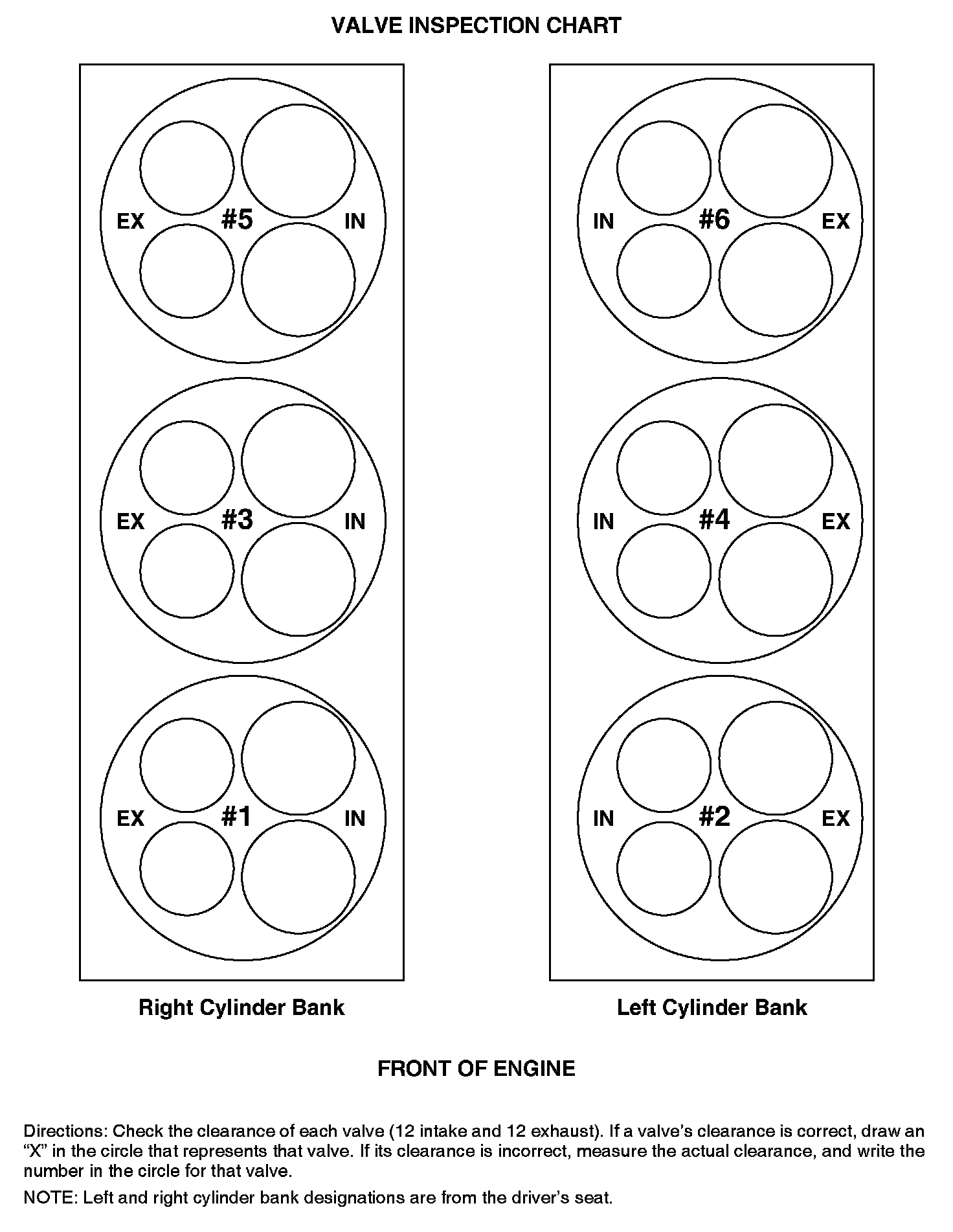 5. For valves with the correct clearance, draw an "X" in the appropriate circle on the Valve Inspection Chart. For valves with incorrect clearances, write down the clearance you measured in the circle.