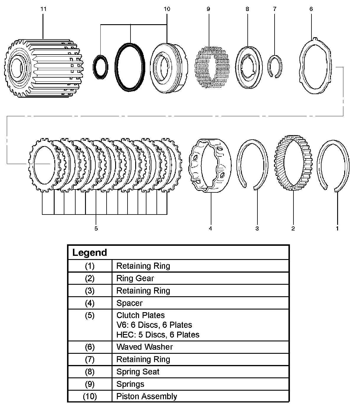 5. Remove spring seat (8), springs (9) and piston assembly (10) from second clutch drum (11).