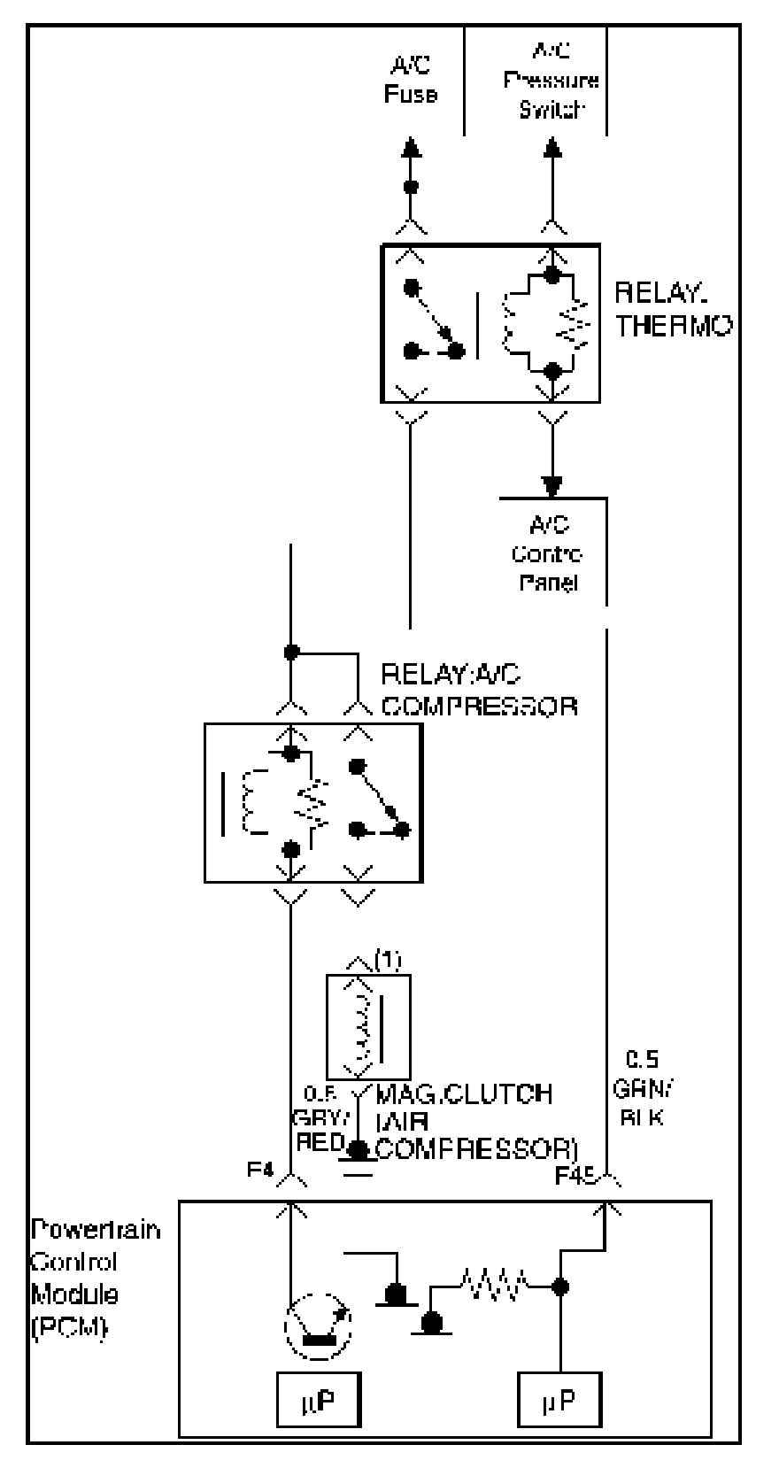 When air conditioning and blower fan are selected, and if the system has a sufficient refrigerant charge, a 12-volt signal is supplied to the A/C request input of the powertrain control module (PCM). The A/C request signal may be temporarily canceled during system operation by the electronic thermostat in the evaporator case. When the A/C request signal is received by the PCM, the PCM supplies a ground from the compressor clutch relay if the engine operating conditions are within acceptable ranges. With the A/C compressor relay energized, voltage is supplied to the compressor clutch coil.