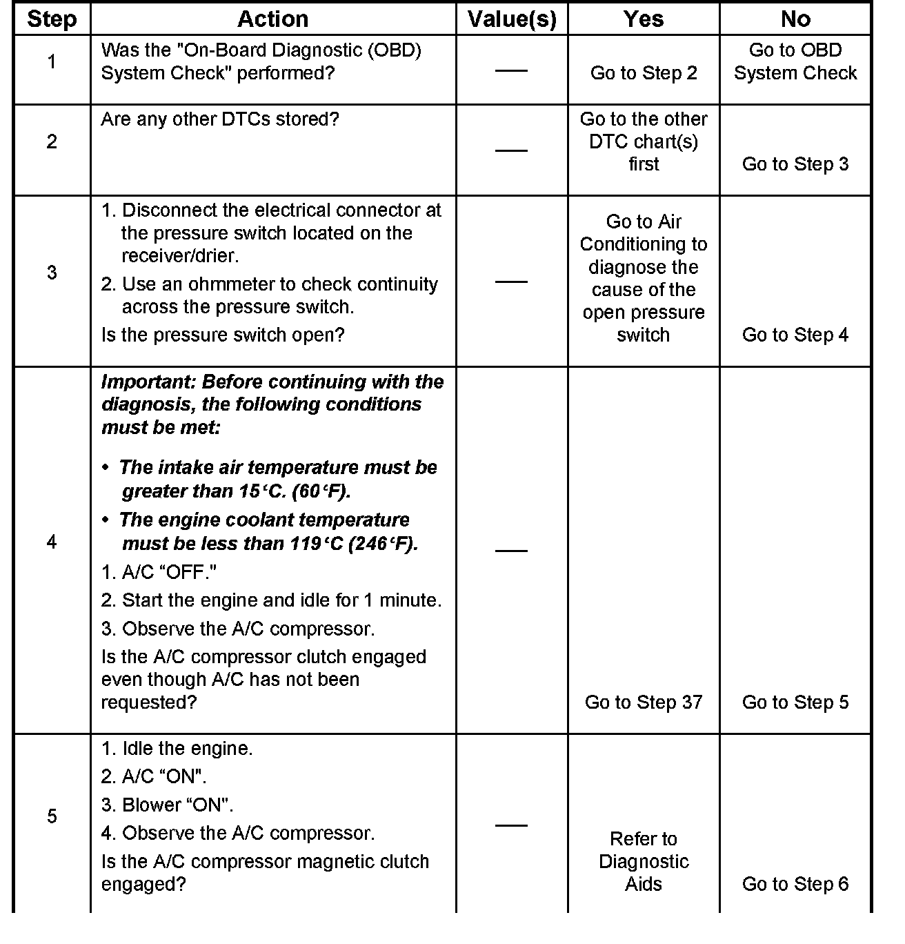 3. This is a test to determine if the problem is with the refrigerant system. If the switch is open, A/C pressure gauges will be used to determine if the pressure switch is faulty or if the system is partially discharged or empty.