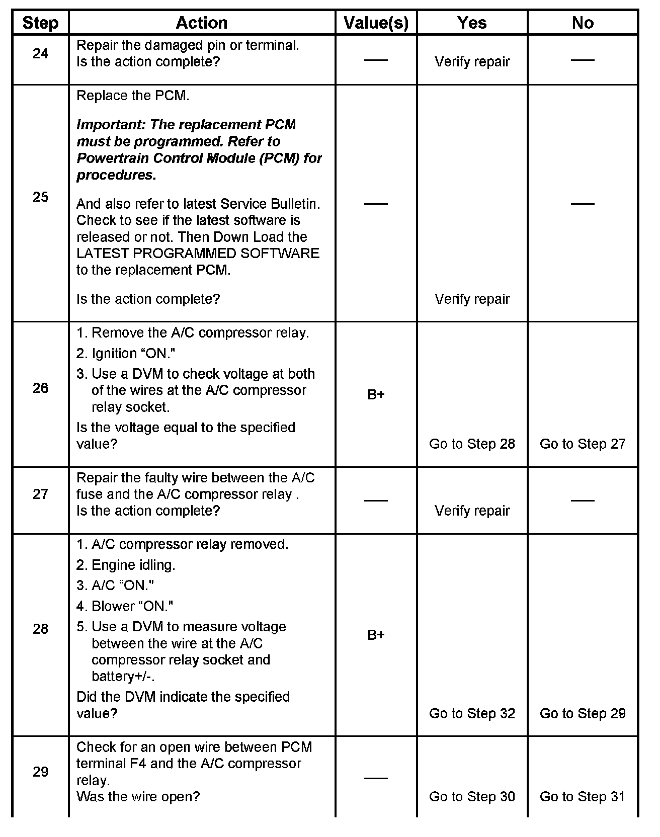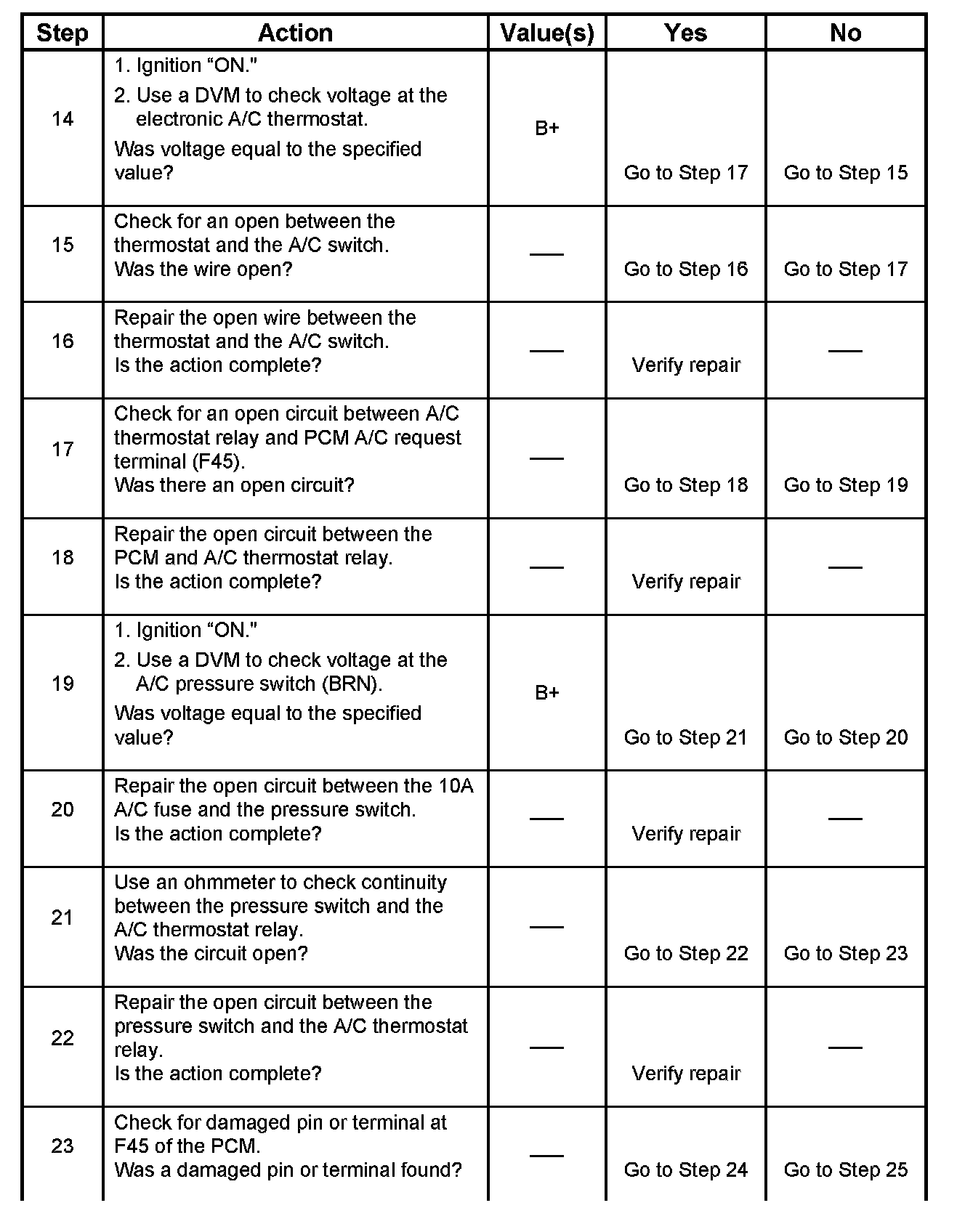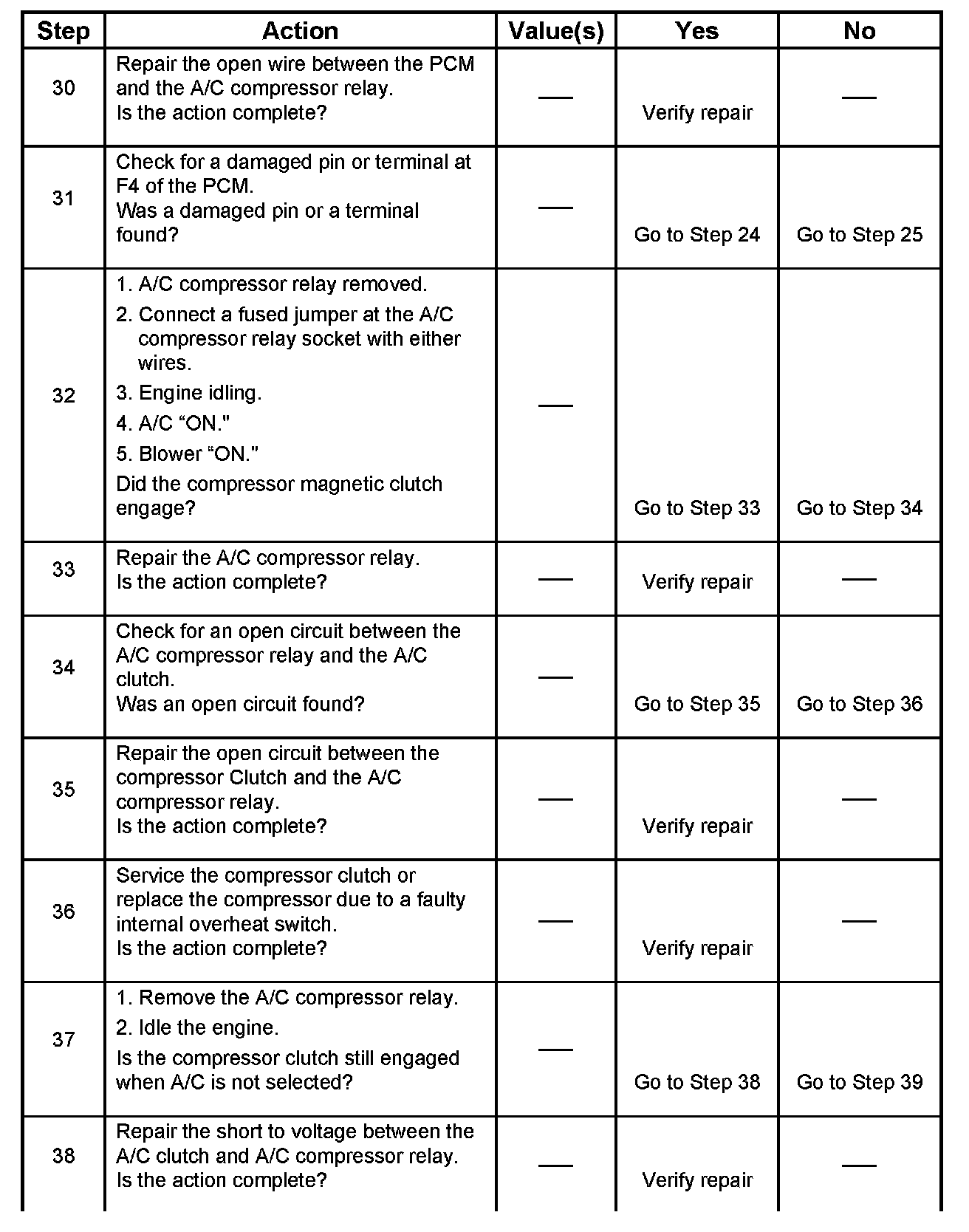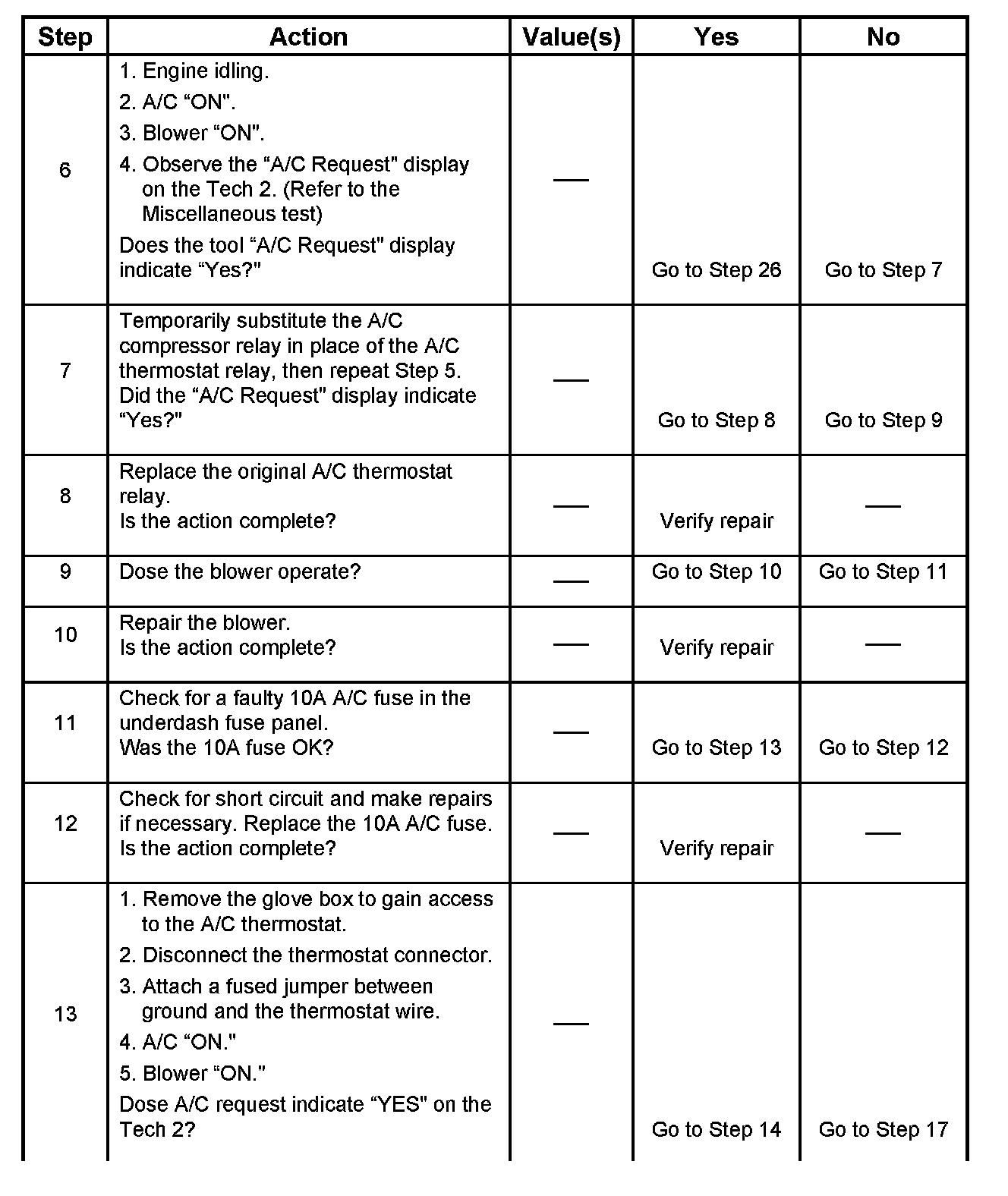 This chart should be used for diagnosing the electrical portion of the A/C compressor clutch circuit. A Tech 2 will be used in diagnosing the system. The Tech 2 has the ability to read the A/C request input to the PCM. The Tech 2 can display when the PCM has commanded the A/C clutch "ON." The Tech 2 should have the ability to override the A/C request signal and energize the A/C compressor relay.
