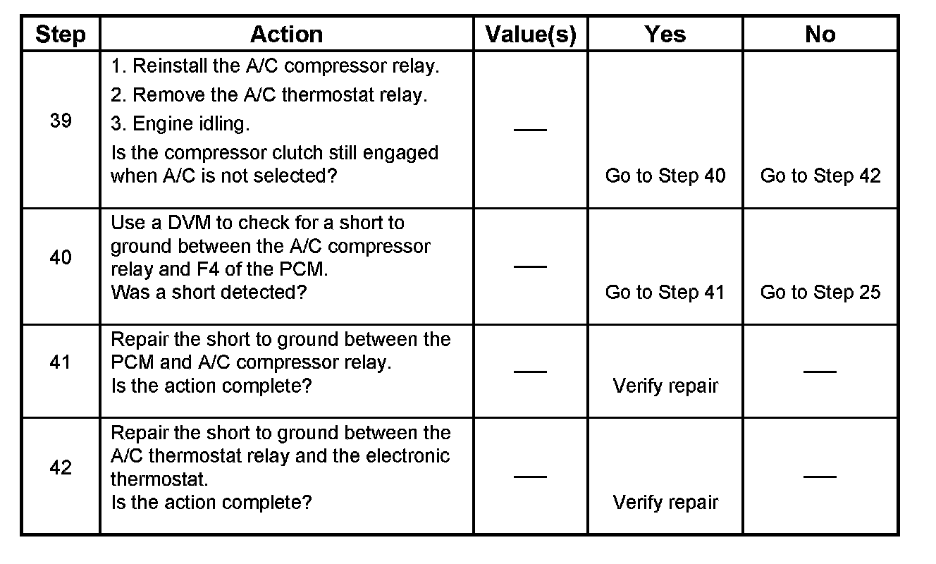 4. Although the normal complaint will be the A/C clutch failing to engage, it is possible for a short circuit to cause the clutch to run when A/C has not been selected. This step is a test for that condition.