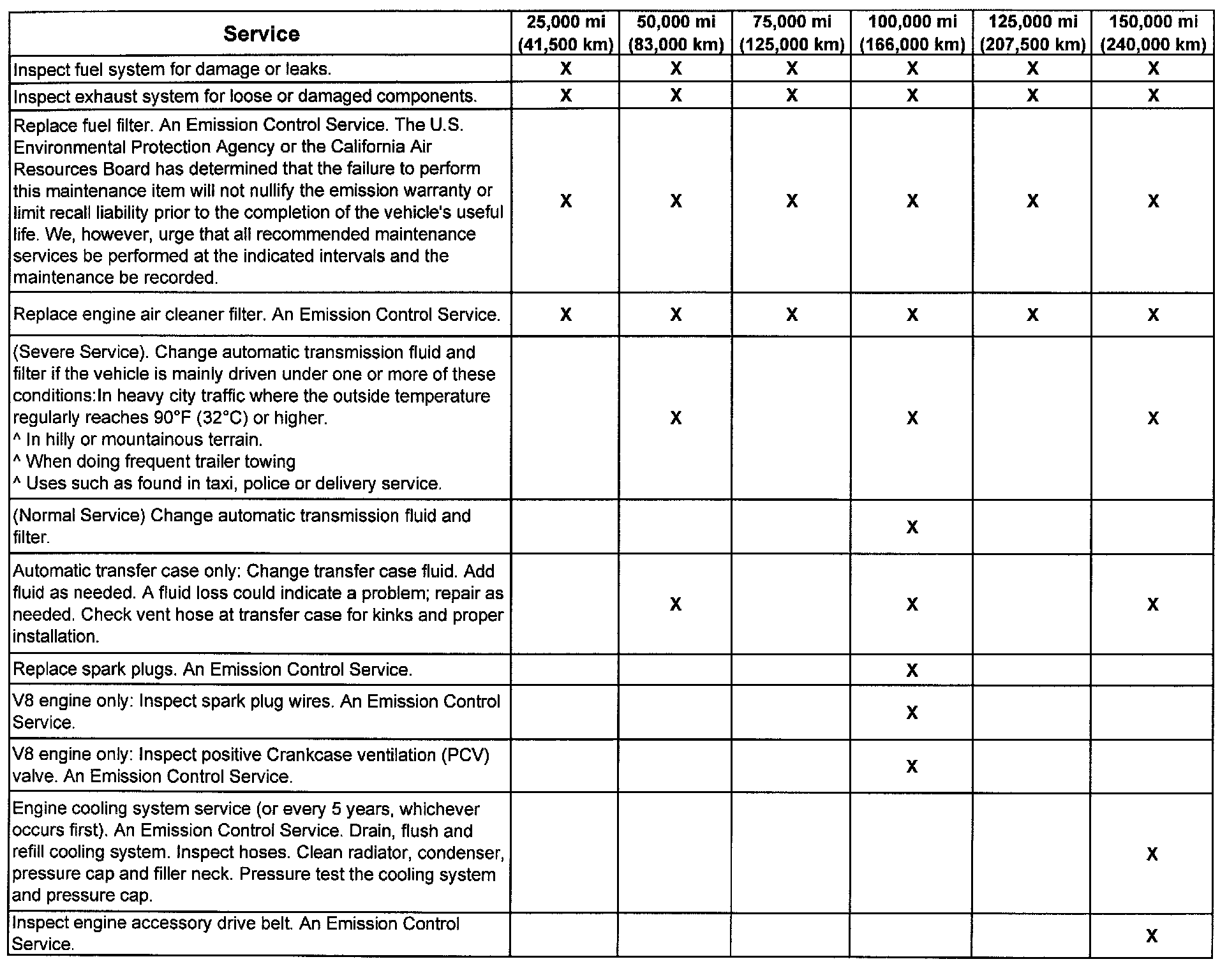 (Maintenance I or Maintenance II) after the indicated kilometers (miles) shown for each item.