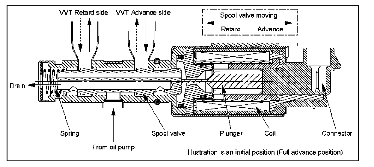 OCV (Oil Control Valve)ECM controls the position of a spool valve by the duty signal from ECM, and is adjusting the oil supply to advance and retard of VVT.