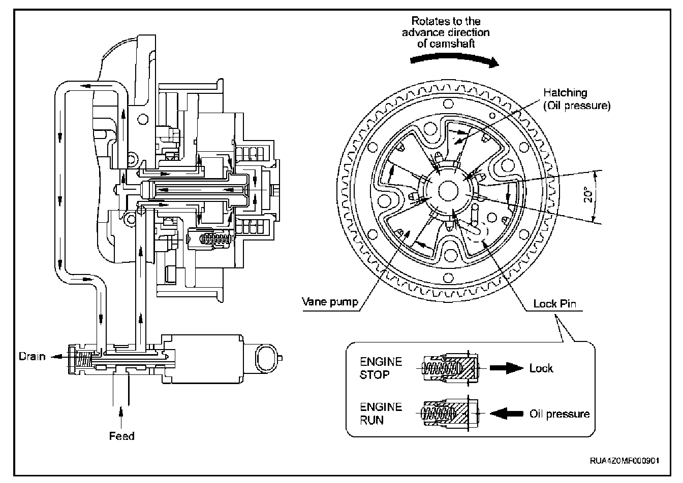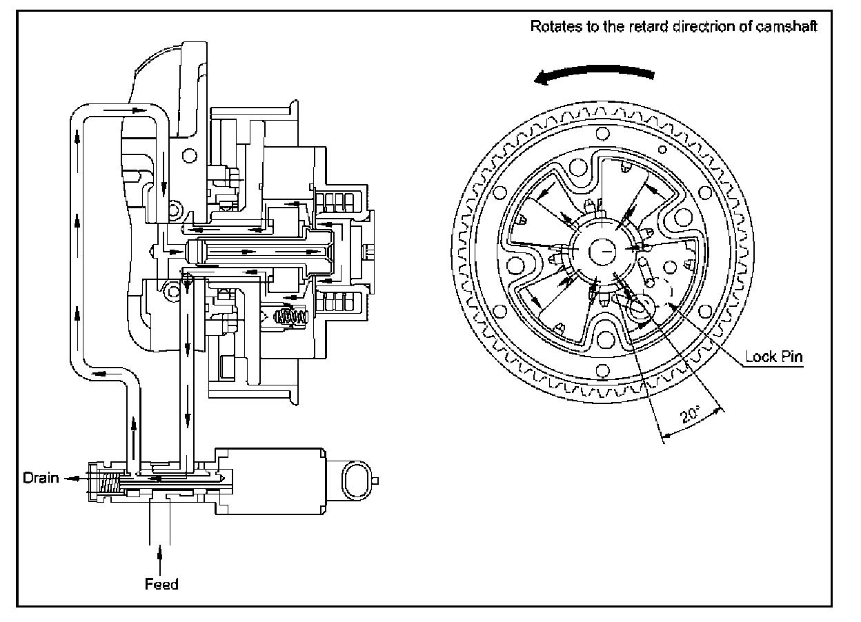 The spool valve of OCV moves to left-hand side, the vane pump rotates to retard side.