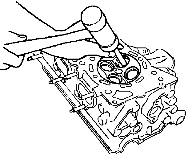 1. Using Valve guide replacer: J-42899, drive out the valve guide from the combustion chamber side.