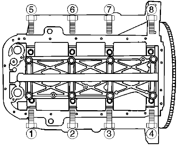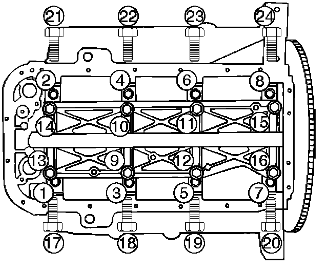 Install main bearing caps, oil gallery and crank case bolts in the order show, and tighten each bolt to the specified torque.