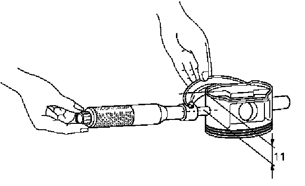 Measure the piston outside diameter with micrometer at the piston grading position and a right angle to the piston pin.