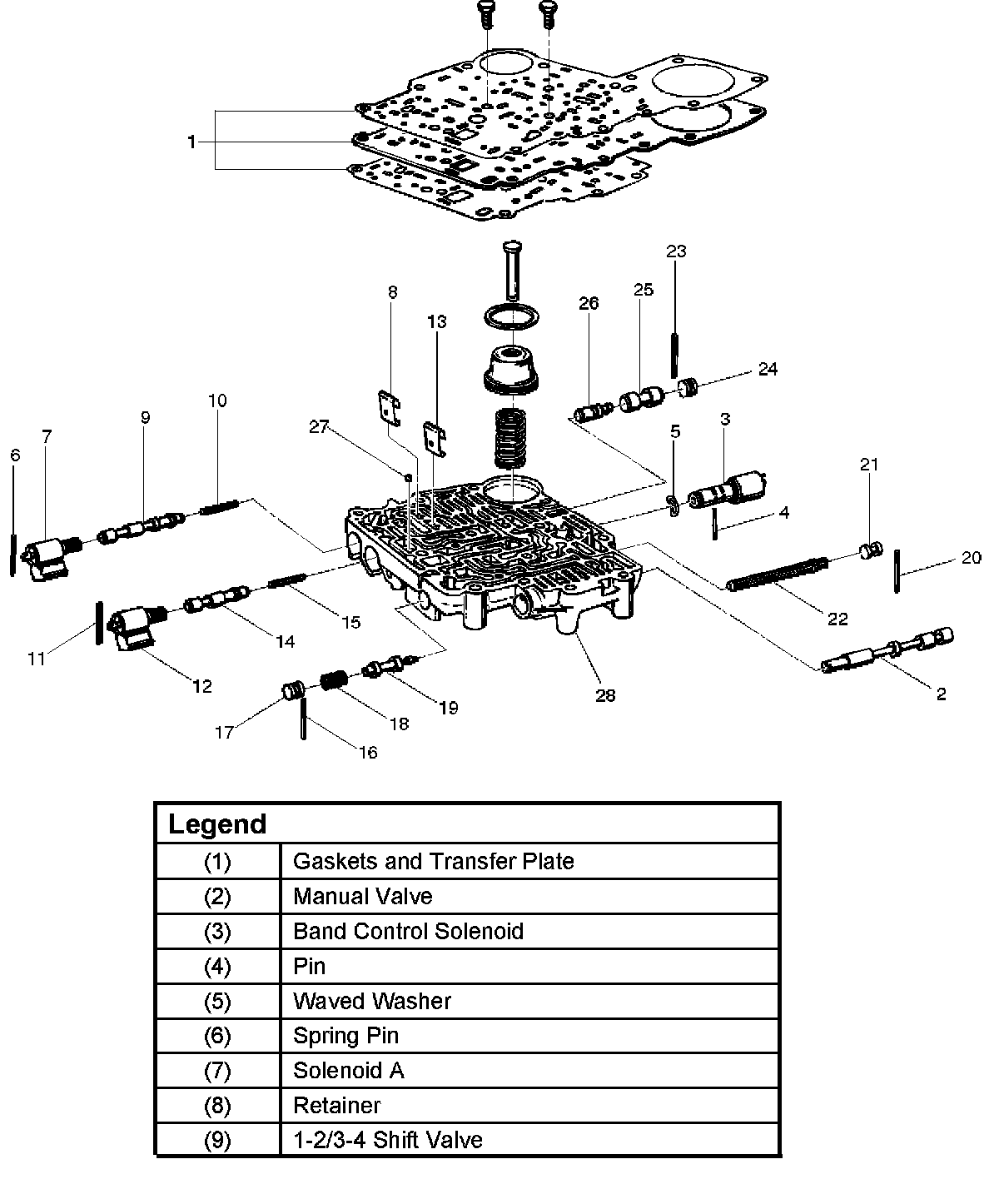 1. Remove two 11 mm bolts from valve body (28), then remove gaskets and transfer plate (1).