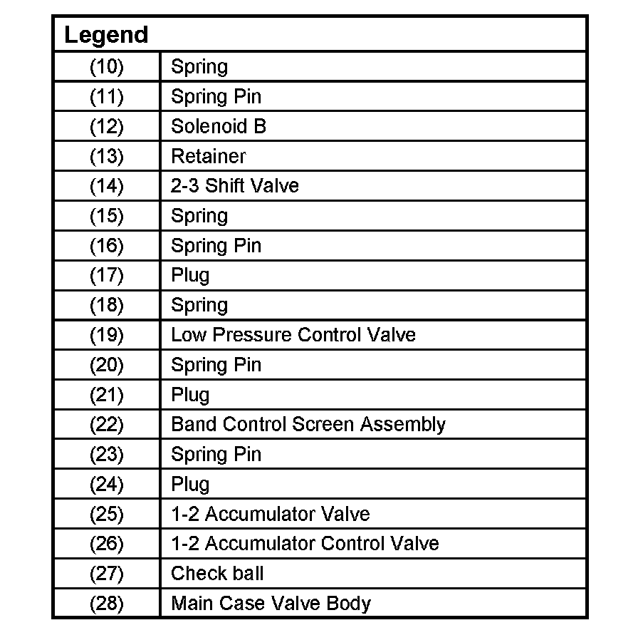 1. Install 1-2 accumulator control valve (26),1-2 accumulator valve (25), plug (24), and spring pin (23).