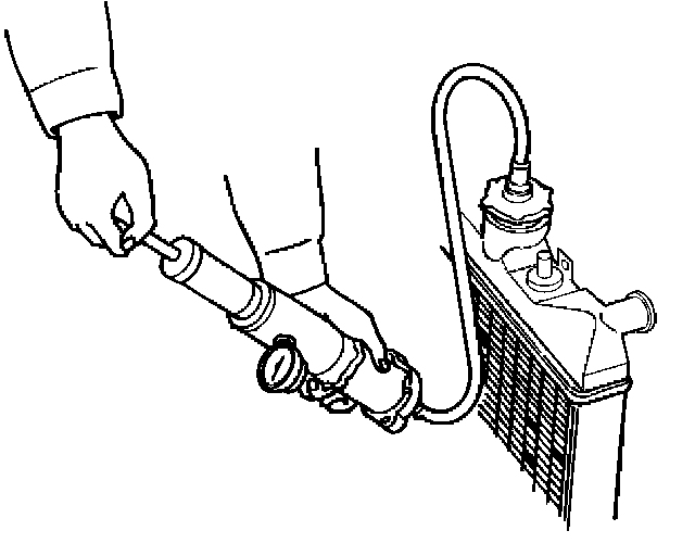 Use a radiator cap tester to force air into the radiator through the filler neck at the specified pressure of 150 kPa (22 psi) with a cap tester: