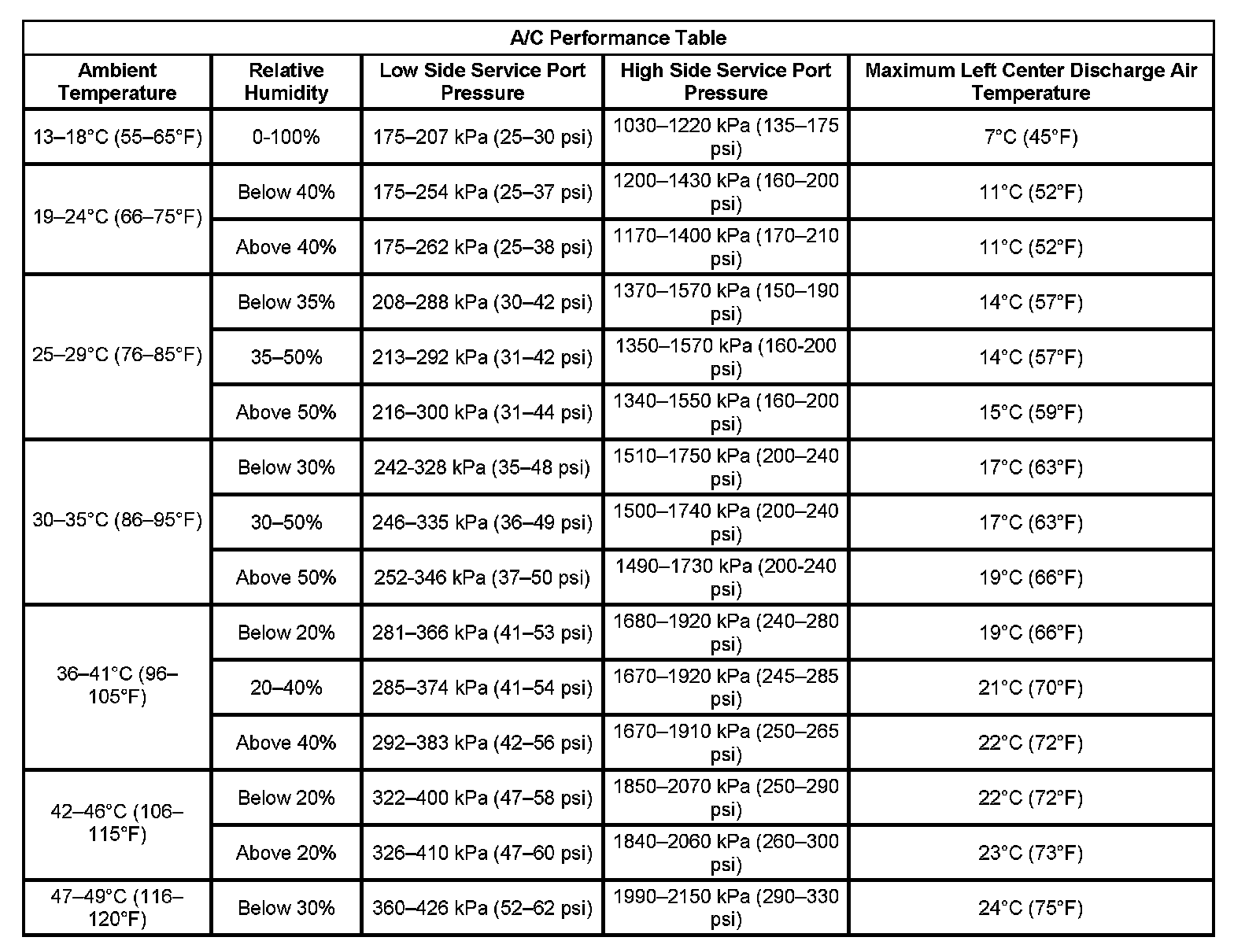 A/C Performance Table:
