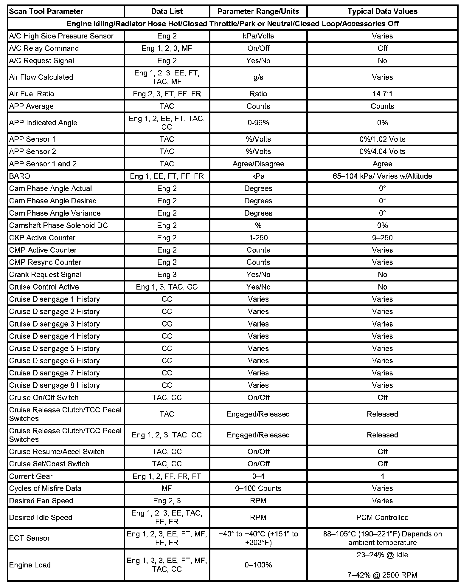 The Engine Scan Tool Data List contains all engine related parameters that are available on the scan tool. The list is arranged in alphabetical order. A given parameter may appear in any one of the data lists, and in some cases may appear more than once, or in more than one data list in order to group certain related parameters together.