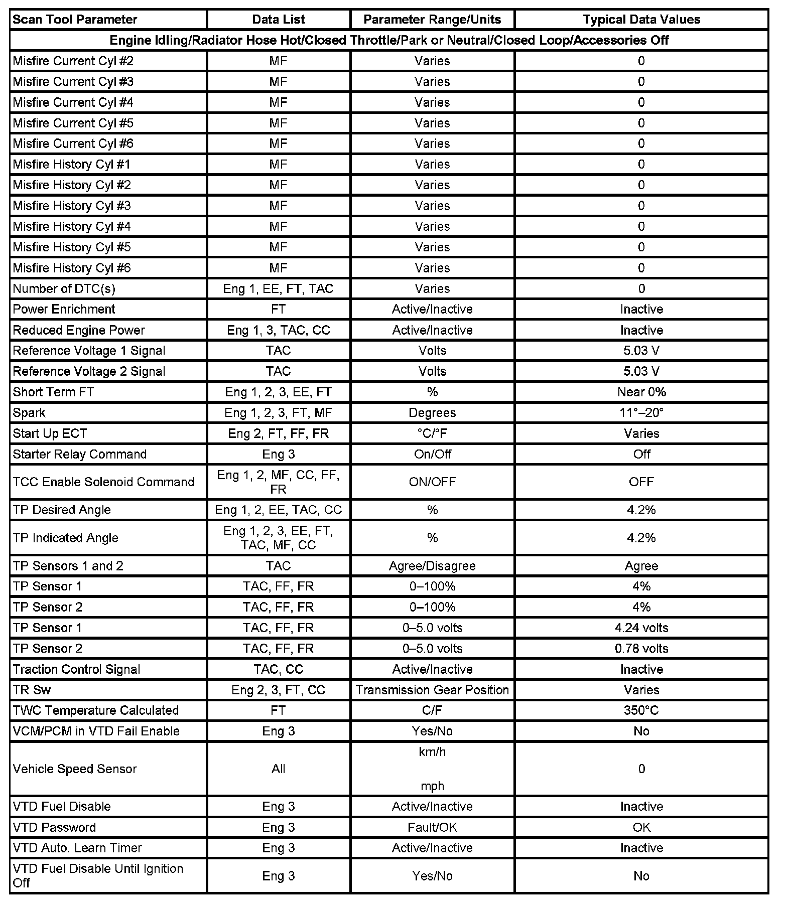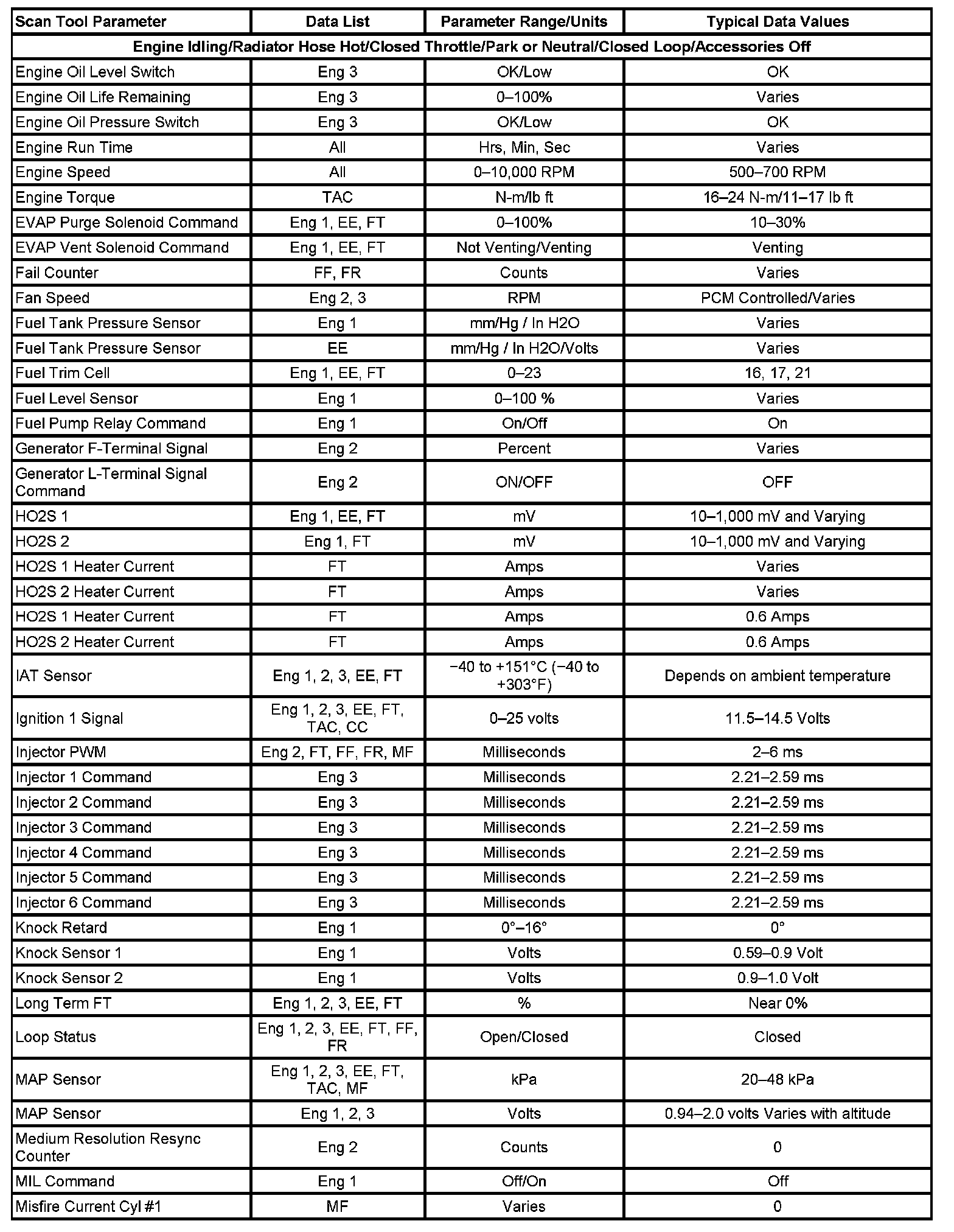 The column labeled Data List indicates where a parameter can be located on the scan tool. Refer to the scan tool operating manual for the exact locations of the data lists. The following is a description of each term listed: