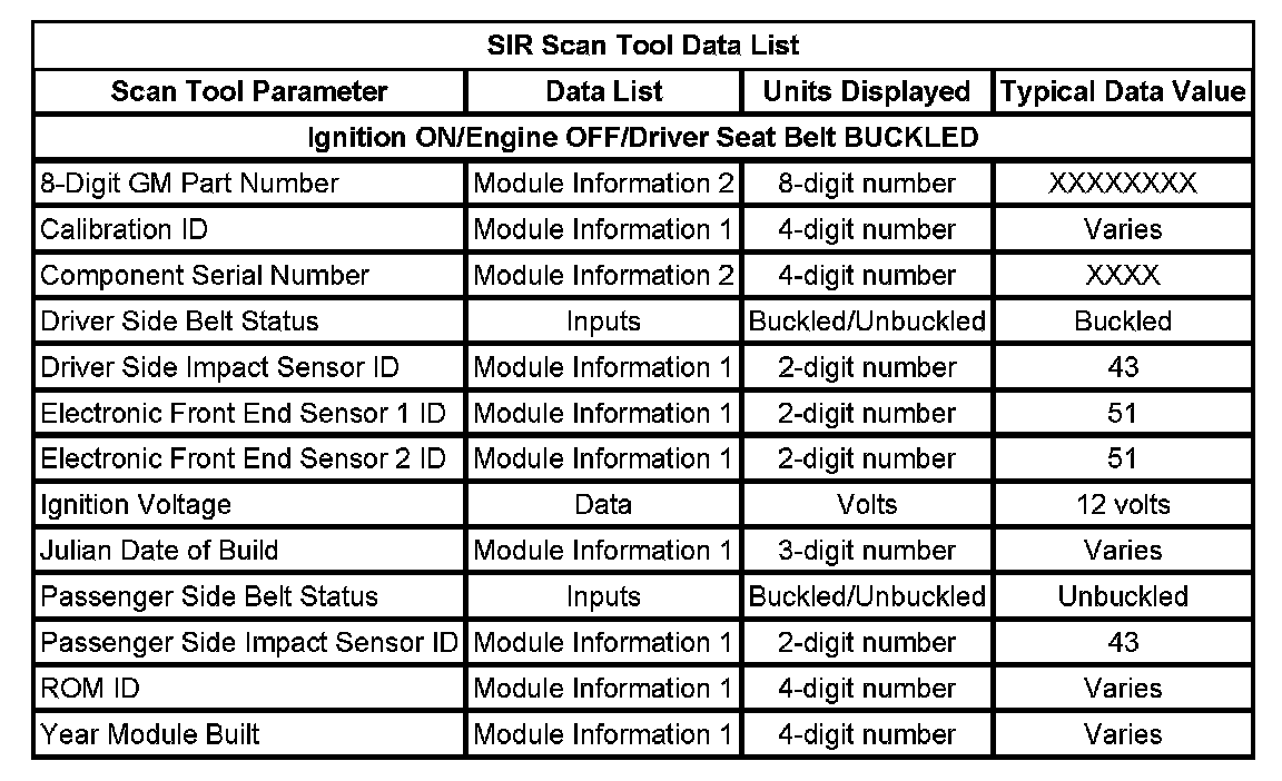 Use the SIR Scan Tool Data List as directed by a diagnostic table or to supplement the diagnostic procedures. Begin all of the diagnostic procedures with the Diagnostic System Check - Vehicle. Refer to the Diagnostic System Check - Vehicle. Use the SIR Scan Tool Data List after determining the following: