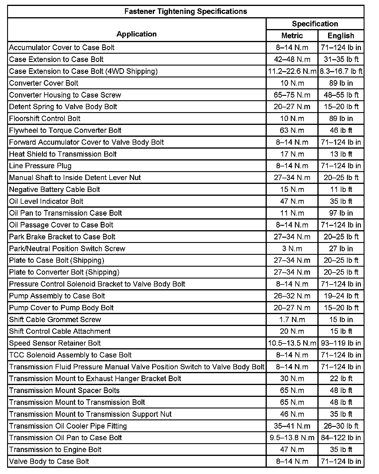 Fastener Tightening Specifications: