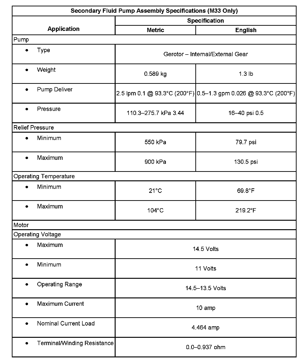 Secondary Fluid Pump Assembly Specifications (M33 Only):