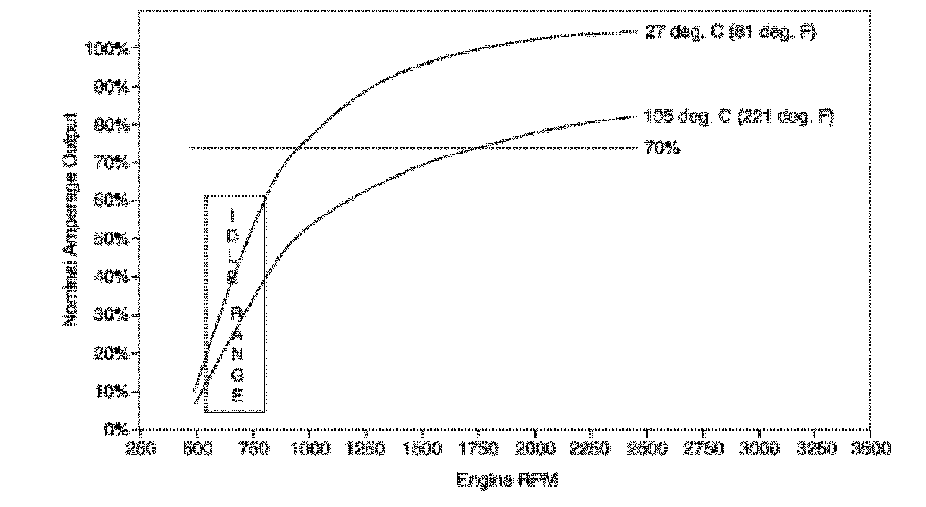 Depending on the vehicle application, generator current (amperage) output at engine idle speeds of 600-700 RPM can be as low as 35 percent of the full rated output. With enough electrical loads "ON", it is easy to exceed