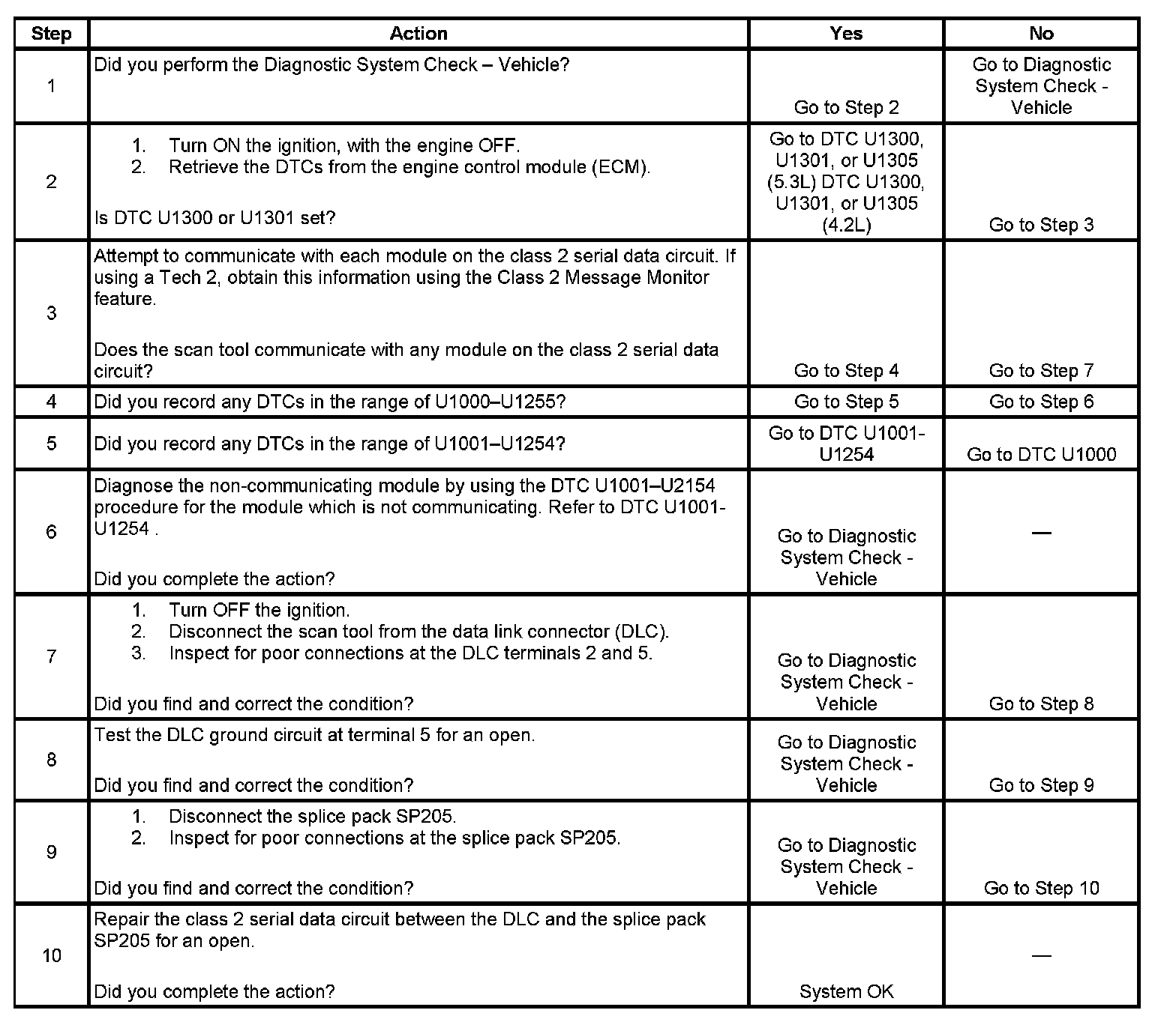 10. An open in the class 2 serial data circuit between the DLC and splice pack SP205 will prevent the scan tool from communicating with any module on the class 2 network. This condition will not set a DTC