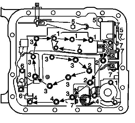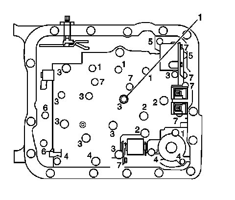 5. Do not install the transmission fluid indicator stop bracket and bolt at this time. Install but do not tighten the control valve body bolts which retain only the valve body directly. Each numbered bolt location corresponds to a specific bolt size and length, as indicated by the following: