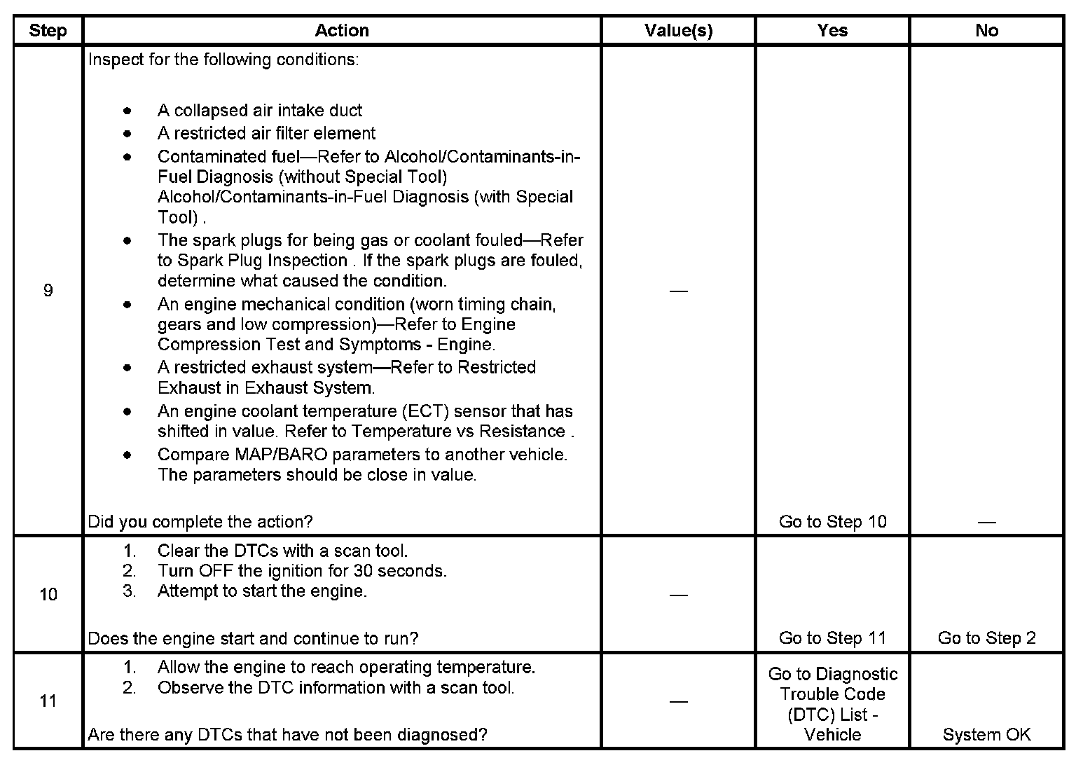 The Engine Cranks but Does Not Run diagnostic table is an organized approach to identifying a condition that causes an engine not to start. The Engine Cranks but Does Not Run diagnostic table directs the service technician to the appropriate system diagnosis.