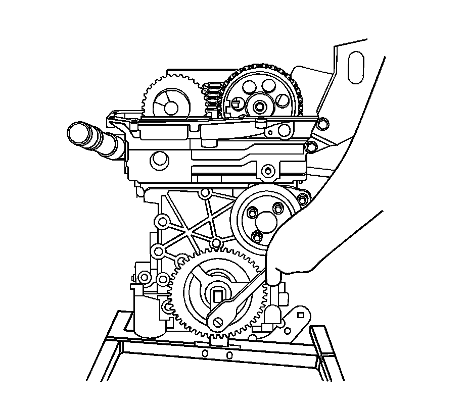 19. Rotate the engine clockwise by hand two complete revolutions to TDC number 1 on the compression stroke. Refer to First Method or Second Method for TDC. If you go past TDC, rotate the engine back approximately 45 degrees before TDC and then rotate clockwise up to TDC to ensure that the timing chain is tight (no slack) between the crank sprocket and the timing gears.