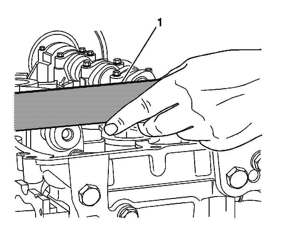 22. A 0.005 inch feeler gage should not be able to slip under the straight edge (1). If the feeler gage slips under one or both camshaft flats, then the timing is off. Repeat step 20 and recheck. If the camshaft flats are still not flat, the camshaft timing will have to be reset. This may require removal and reinstallation of one or both camshaft sprockets.
