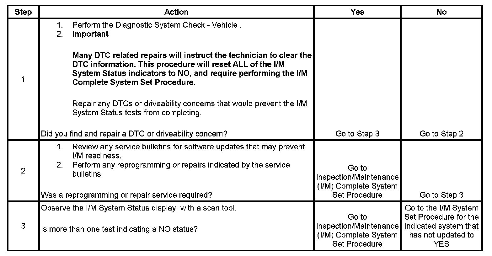 Each system requires at least one, and sometimes several, diagnostic tests. The results of these tests are reported by a DTC. A system monitor is complete when either all of the DTCs comprising the monitor have Run and Passed, or any one of the DTCs comprising the monitor have illuminated the malfunction indicator lamp (MIL). Once all of the tests are completed, the I/M System Status display will indicate YES in the Completed column. For example, when the heated oxygen sensor (HO2S) Heater Test indicates YES, all of the oxygen sensor heaters have been diagnosed. If the vehicle has 4 heated oxygen sensors, all 4 heater circuits have been diagnosed. The I/M System Status will indicate NO under the Completed column when any of the required tests for that system have not run. The following is a list of conditions that would set the I/M System Status indicator to NO: