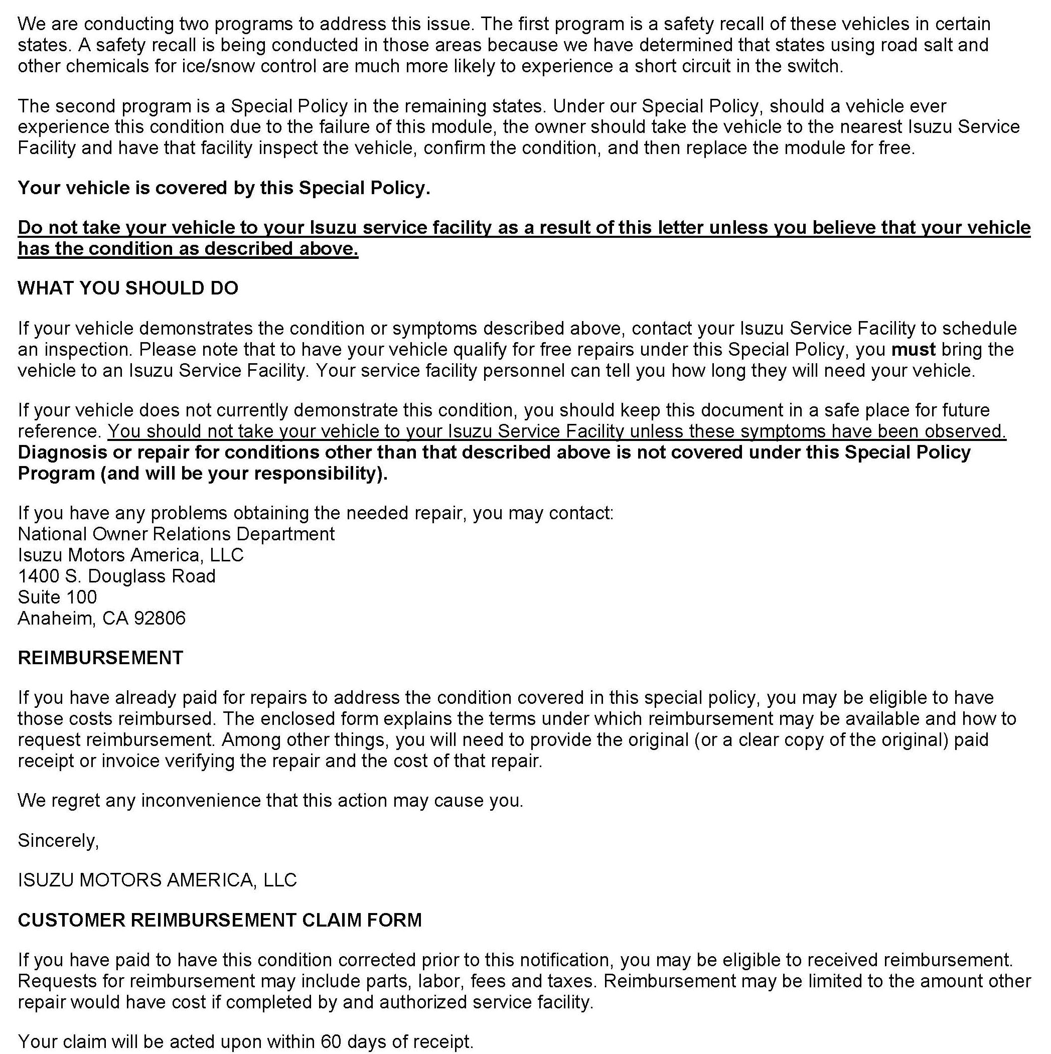 Isuzu will notify customers of this special policy on their vehicle (see copy of typical letter included with this bulletin).
