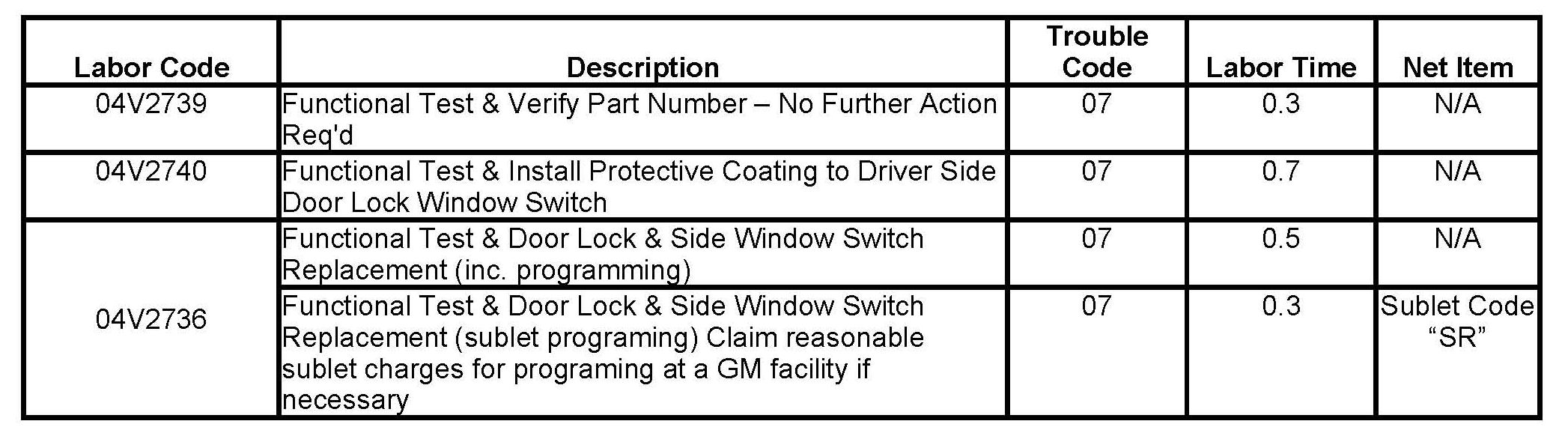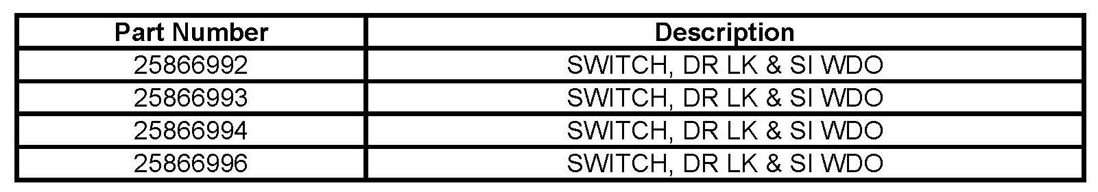 a) If the part number on the switch is listed in the parts table, no repair is required. Reinstall the driver side door lock and side window switch. Refer to Door Lock and Side Window Switch Replacement - Driver Side in the service manual, and then proceed to Step 19 of this bulletin, "Applying the Campaign Label".