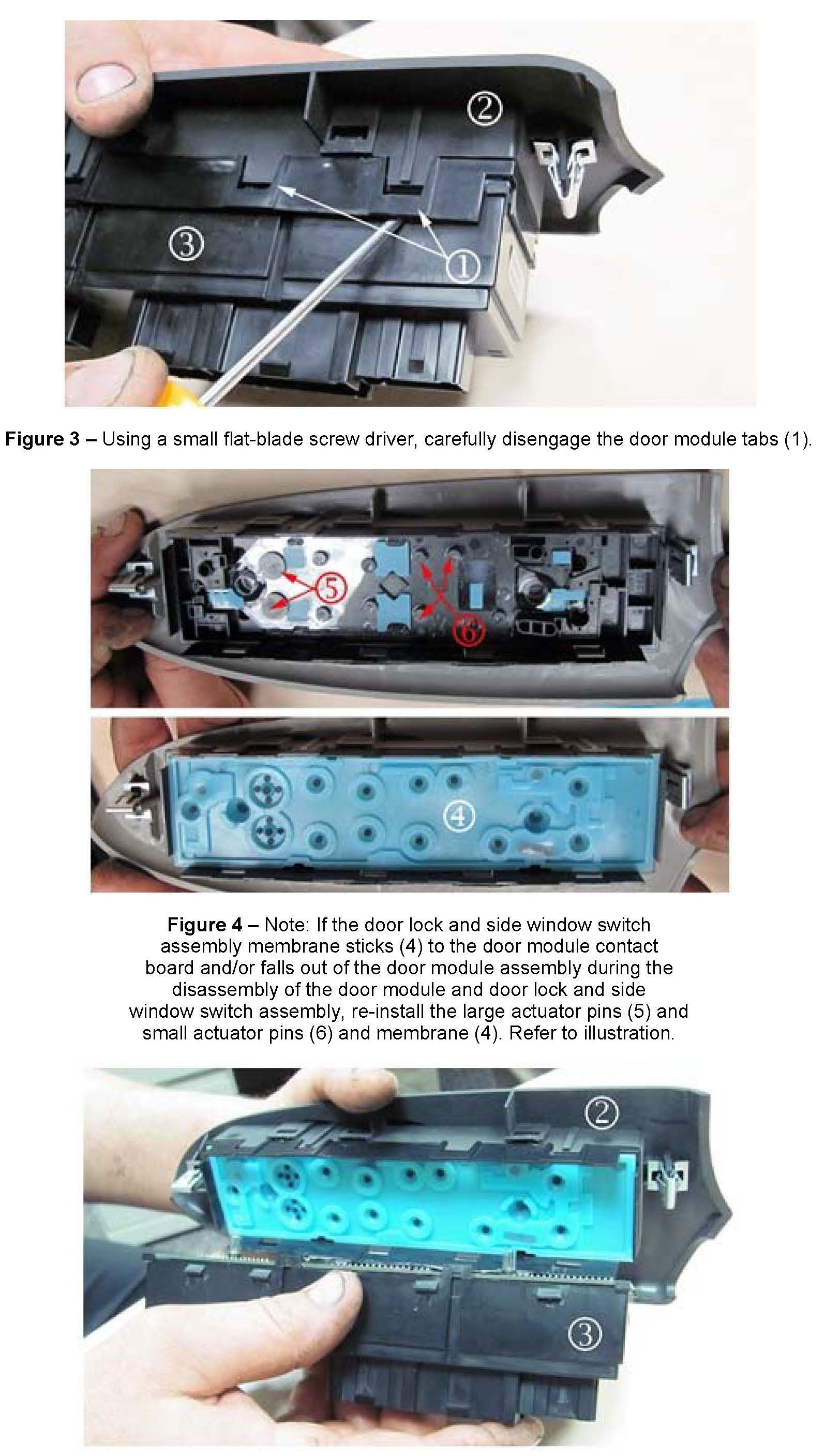 To avoid part damage, ensure your hands and work bench are clean BEFORE performing the door lock and side window switch and door module modifications in this bulletin.