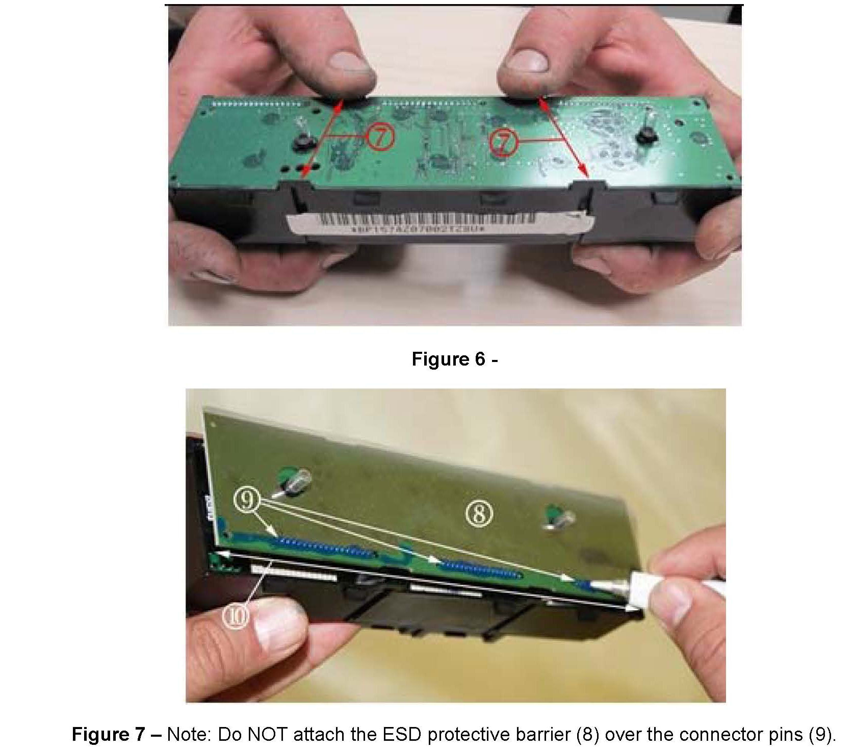 8. Remove the backing paper from the ESD protective barrier (8) and attach it to the contact board. Attach the ESD protective barrier (8) along the edge of the connector pins (9). See Figure 7.
