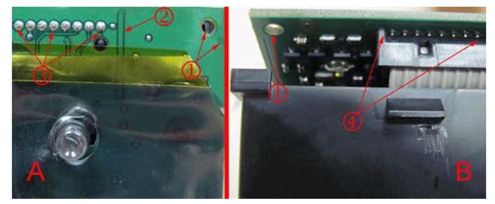 Figure 8 - Top "A" and bottom "B" views of the contact board include examples of connector (4), connector pins (3), traces (2) and vias (1).