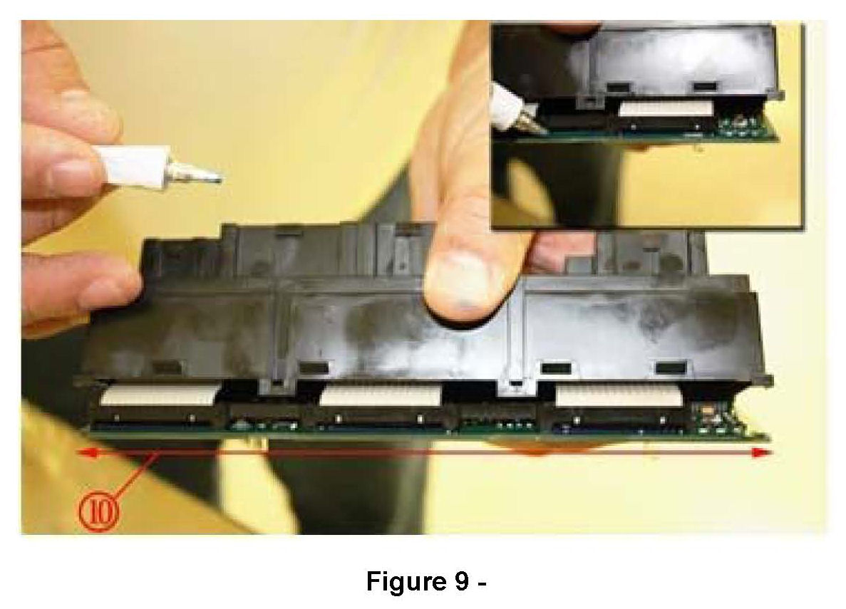 11. Apply the protective coating to the bottom side of the contact board. Apply the protective coating over the entire length (10) of the contact board.