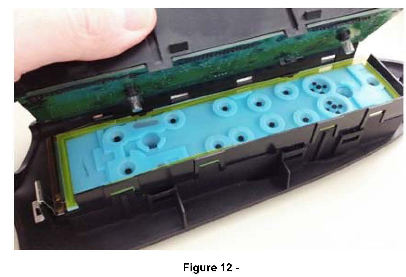 15. Insert the Mylar Kapton gasket (10) to the inside surface covering the open cutouts of the door lock and side window switch membrane.