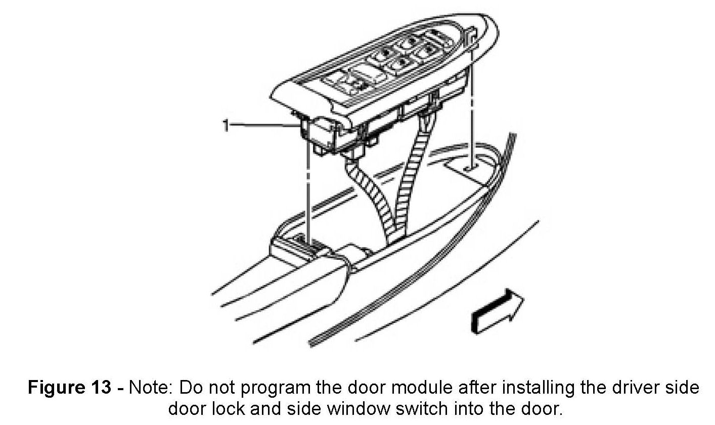 b) If the driver side door lock and side window switch does NOT pass the functional test, replace the driver side door lock and side window switch. Refer to Door Lock and Side Window Switch Replacement - Driver Side in the service manual. After completing the replacement of the door lock and side window switch, proceed to Step 19 of this bulletin,