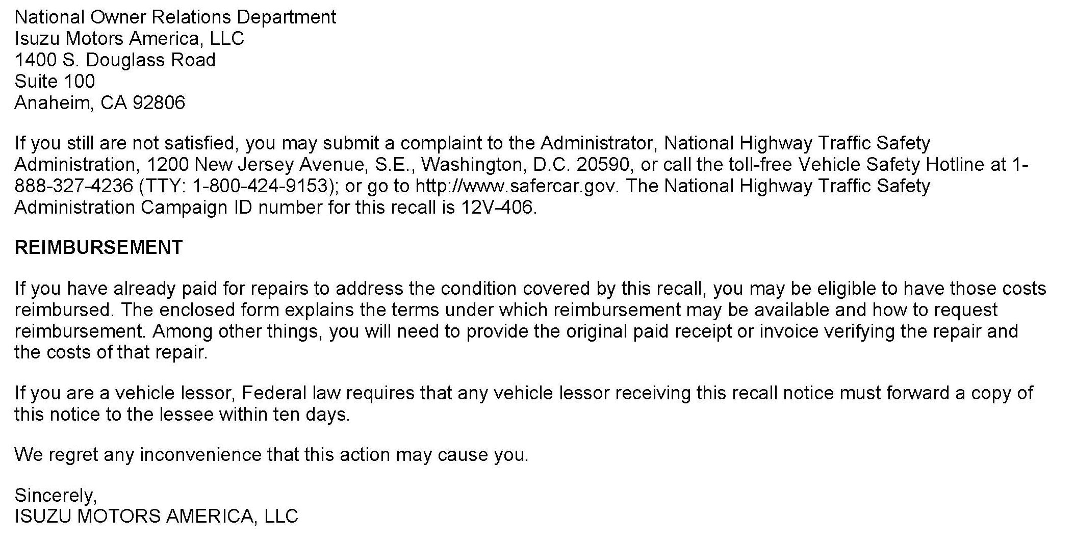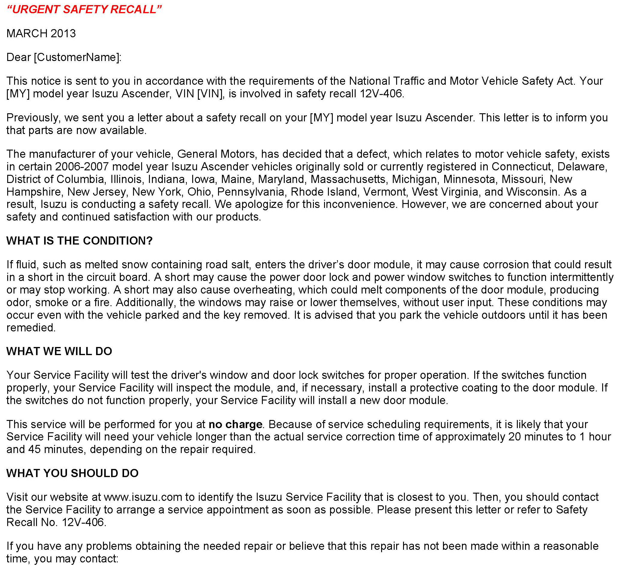 Isuzu will notify customers of this recall on their vehicle (see copy of typical letter included with this bulletin).