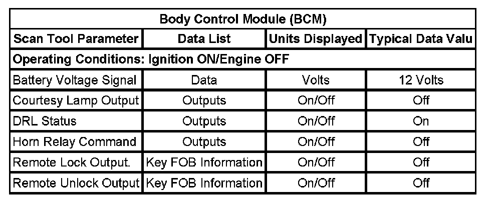 The Keyless Entry Scan Tool Data List contains all of the keyless entry related parameters that are available on the scan tool. The parameters in the list are arranged in alphabetical order. The column, "Data List," indicates the location of the parameter within the scan tool menu selections. Use the Keyless Entry Scan Tool Data List as directed by a diagnostic table or in order to supplement the diagnostic procedures. Begin all of the diagnostic procedures with Diagnostic System Check - Vehicle. Diagnostic System Check - Vehicle