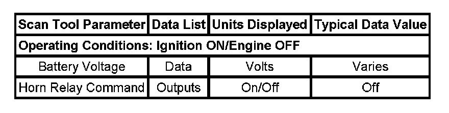 The Horns Scan Tool Data List contains all of the horn related parameters that are available on the scan tool. The parameters in the list are arranged in alphabetical order. The column, "Data List," indicates the location of the parameter within the scan tool menu selections. Use the Horns Scan Tool Data List as directed by a diagnostic table or in order to supplement the diagnostic procedures. Begin all of the diagnostic procedures with Diagnostic System Check - Vehicle. Diagnostic System Check - Vehicle